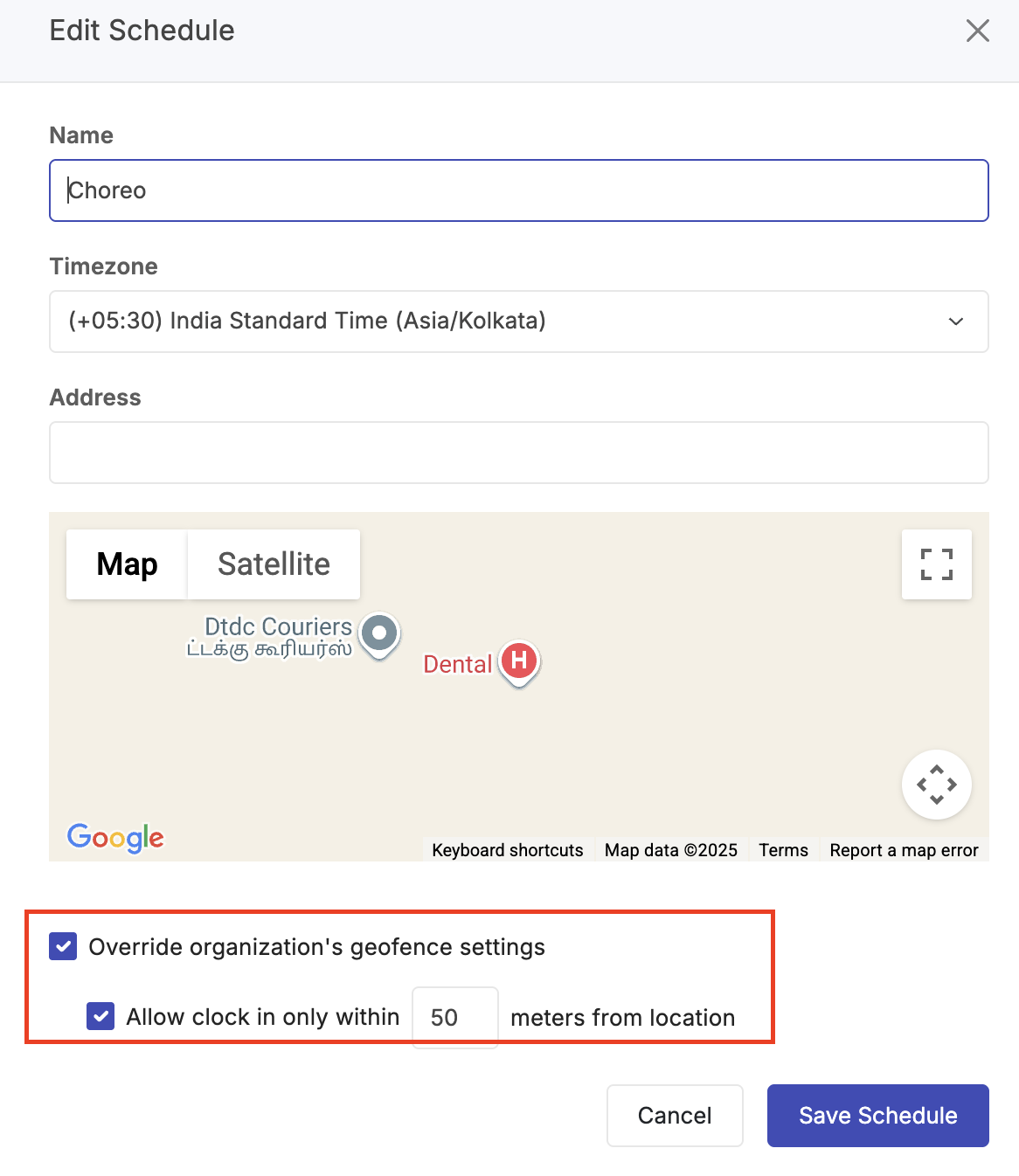 EnhancementsWhen you restrict your employees' clock-in location, a radius circle will appear on the map (visible under Schedules or Job Sites setting). You can adjust it to ensure the exact location, which is helpful when applying geofencing to a particular schedule or job site.