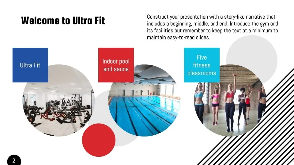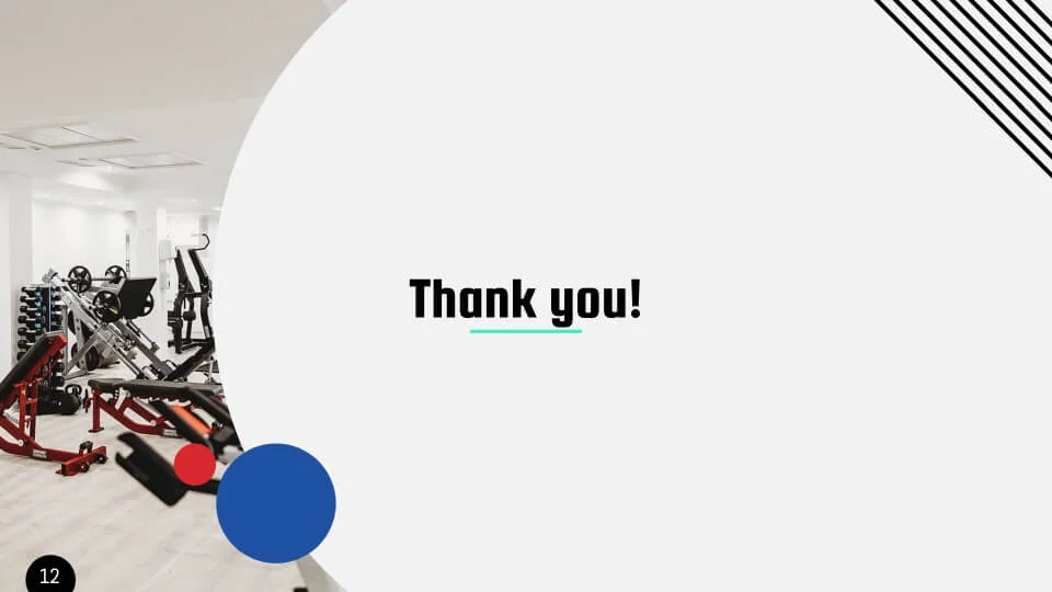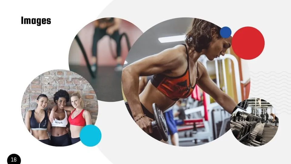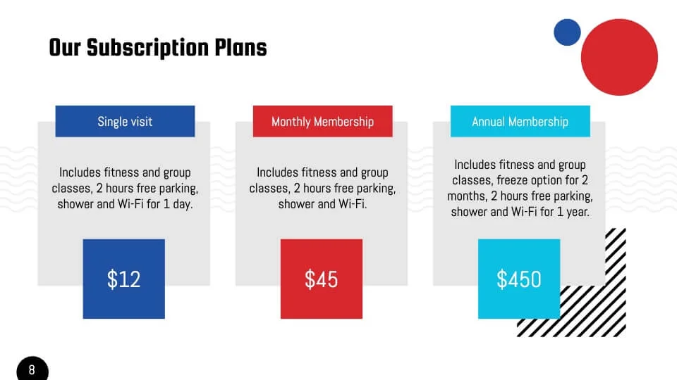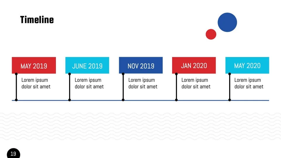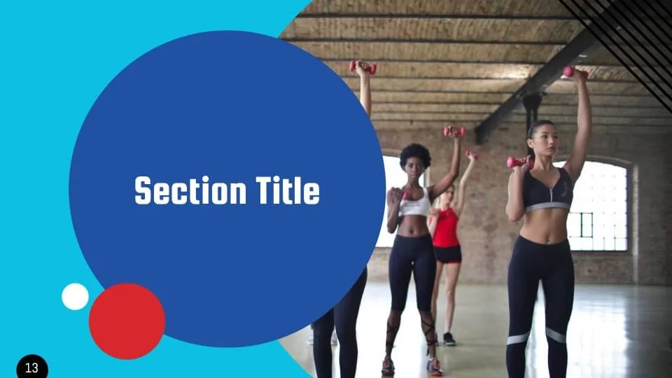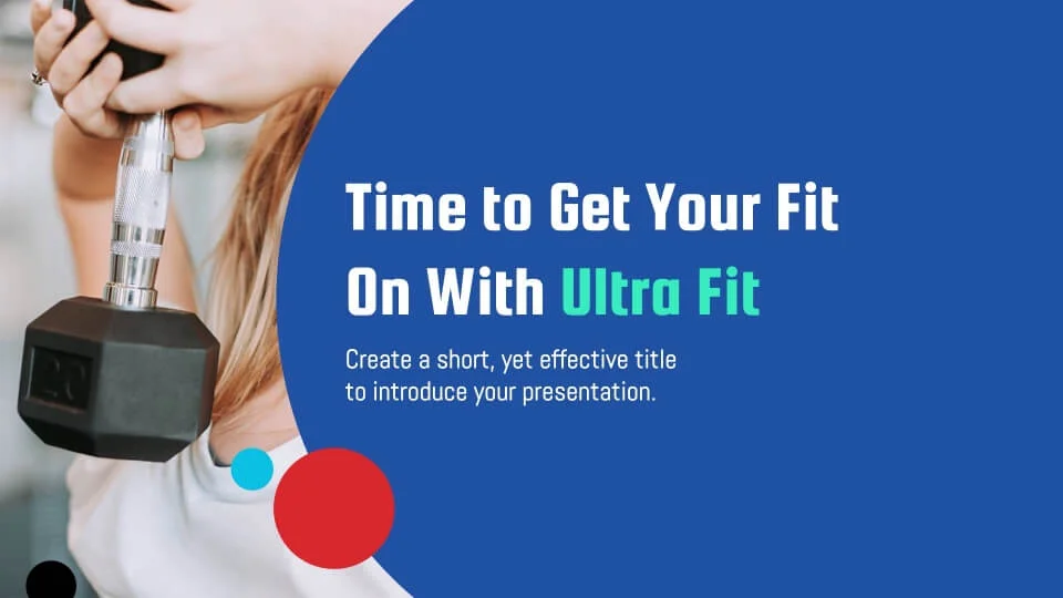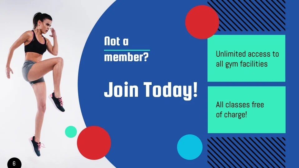 Playful geometric designs accented with blue and red highlights combine to create an energetic slide deck that will get your audience going.