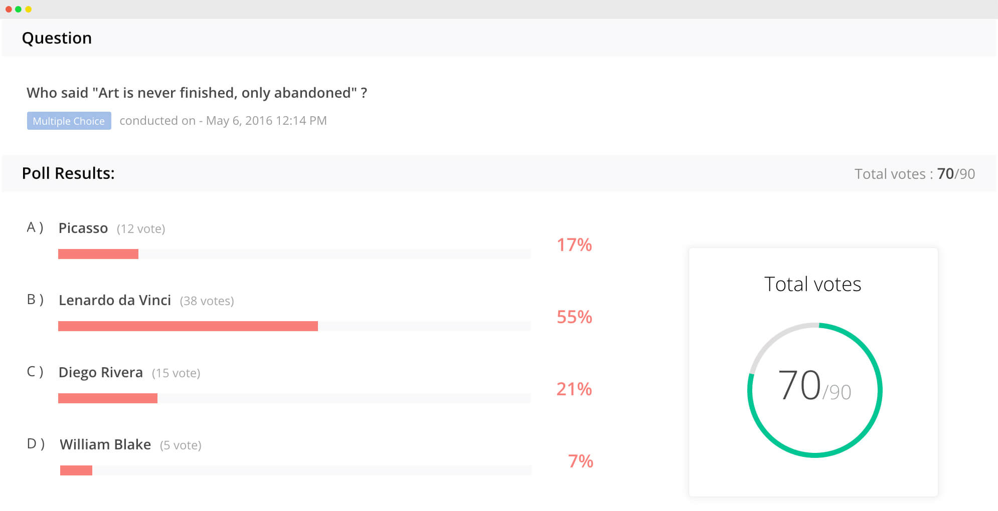 Poll analytics help trainers derive meaningful and intelligent insights based on responses received. Measure responses from both live and remote participants. Make sure every voice is heard.