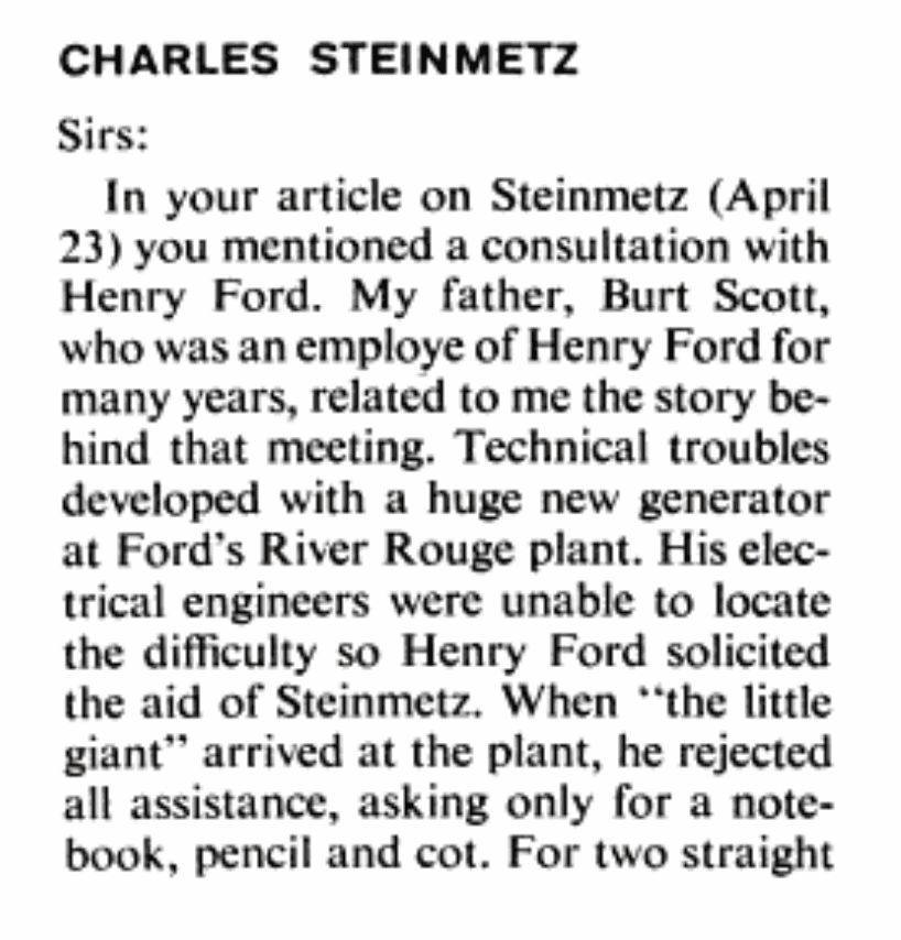 Back in April that year, the magazine published an article on the electrical genius Charles Proteus Steinmetz on the occasion of his birth centenary. In it, the writer had mentioned a meeting between Steinmetz and Henry Ford regarding a complex technical issue that the automobile pioneer was facing at one of his plants. There weren't any specific details about the meeting in the article, but that changed when Life received a letter from one Jack B. Scott.