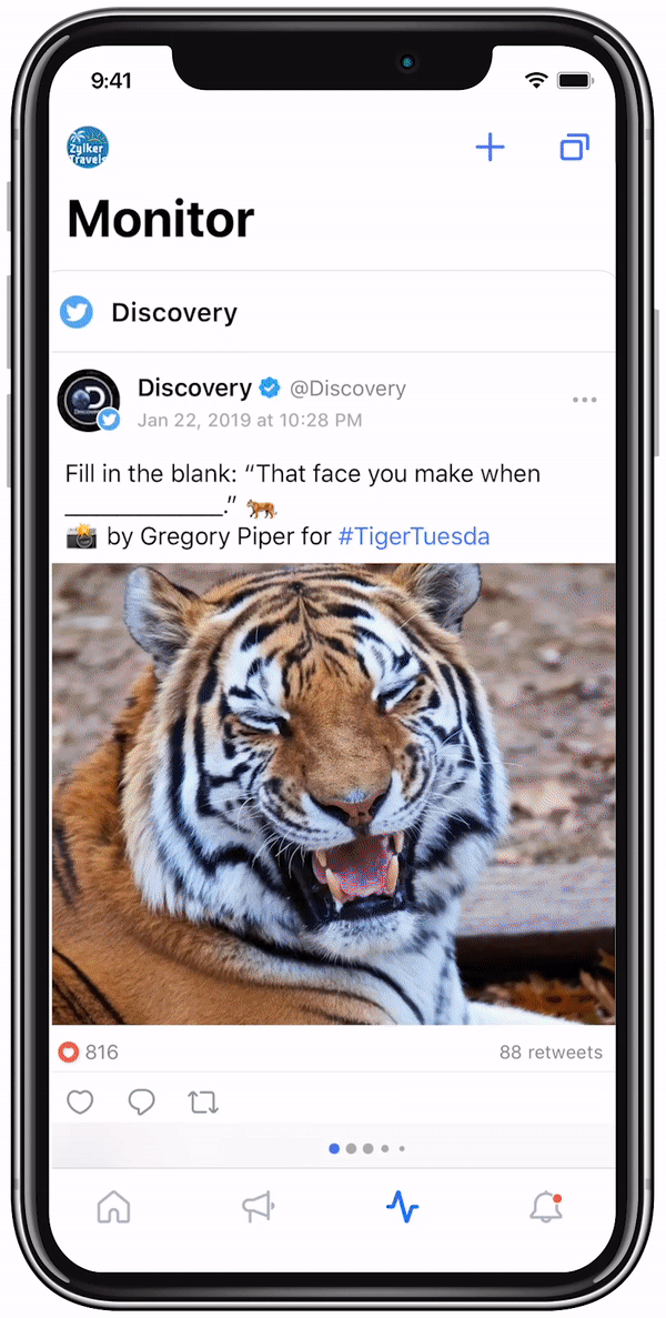 That's where social media monitoring comes in. You can create and swipe through multiple monitoring cards, customize the screen the way you want, and track important keywords, hashtags, and users. The app also makes it easy for you to stay connected to your audience and engage with them directly, while you're on the move.
