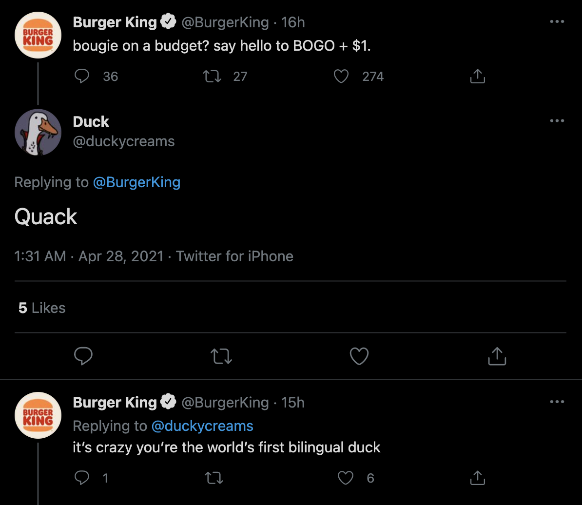 You can gauge your audience's tone through social listening. It helps you understand what's important to them and identify their trends so you can create content that's relevant and engaging for them. For instance, take a look at Burger King on twitter—they try to blend in with all kinds of audiences with a quirky tone.