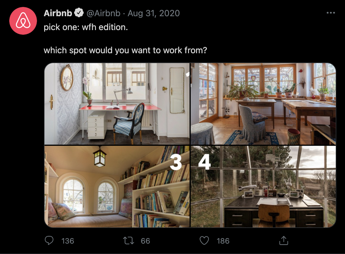 One brand that's great at engaging their audience through social media-specific content is AirBnb. Their Twitter handle is less whimsical and more witty, catering to millennial slang, whereas their Instagram handle looks like a traveler's diary, filled with dream destinations and user-generated content from guests who stay at AirBnBs.