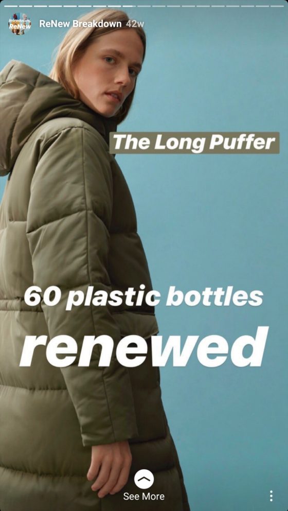 On top of this, Everlane also does more than just promote their products when they show them off in their stories. With a focus on conversation, the brand also explicitly states how their products benefit the environment. Here’s an example from their ReNew series: