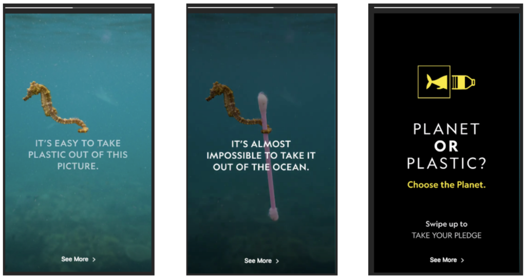 In the last story, they also add a swipe up link, which takes the audience to their landing page. Here, visitors can pledge to reduce plastic consumption, and even share this pledge on other social channels.