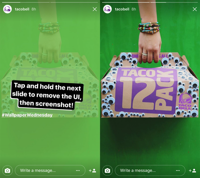 These stories are usually well crafted, and Taco Bell encourages their followers to take a screenshot of these perfectly proportioned Instagram Stories and then use them as a phone background. Their hope is that this will increase the chance of a friend looking at your phone and asking you if you want to go to Taco Bell. Free advertisement? Check!