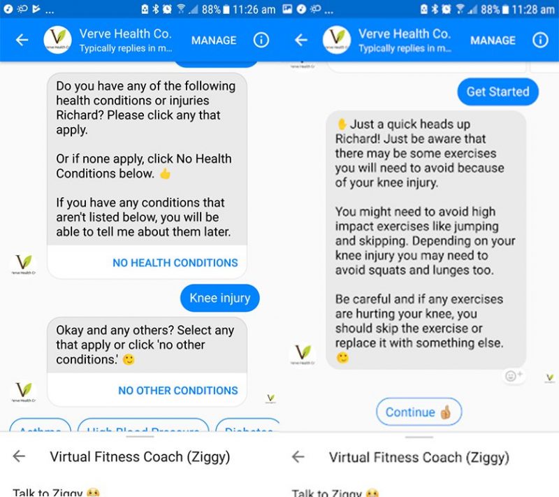 But there are opportunities to go a step further. It’s possible to set up your chatbot to ask questions, and then modify future communication depending on the responses that you get. An example of this is Verve, who provide personalized workout programs depending on injuries you might have.