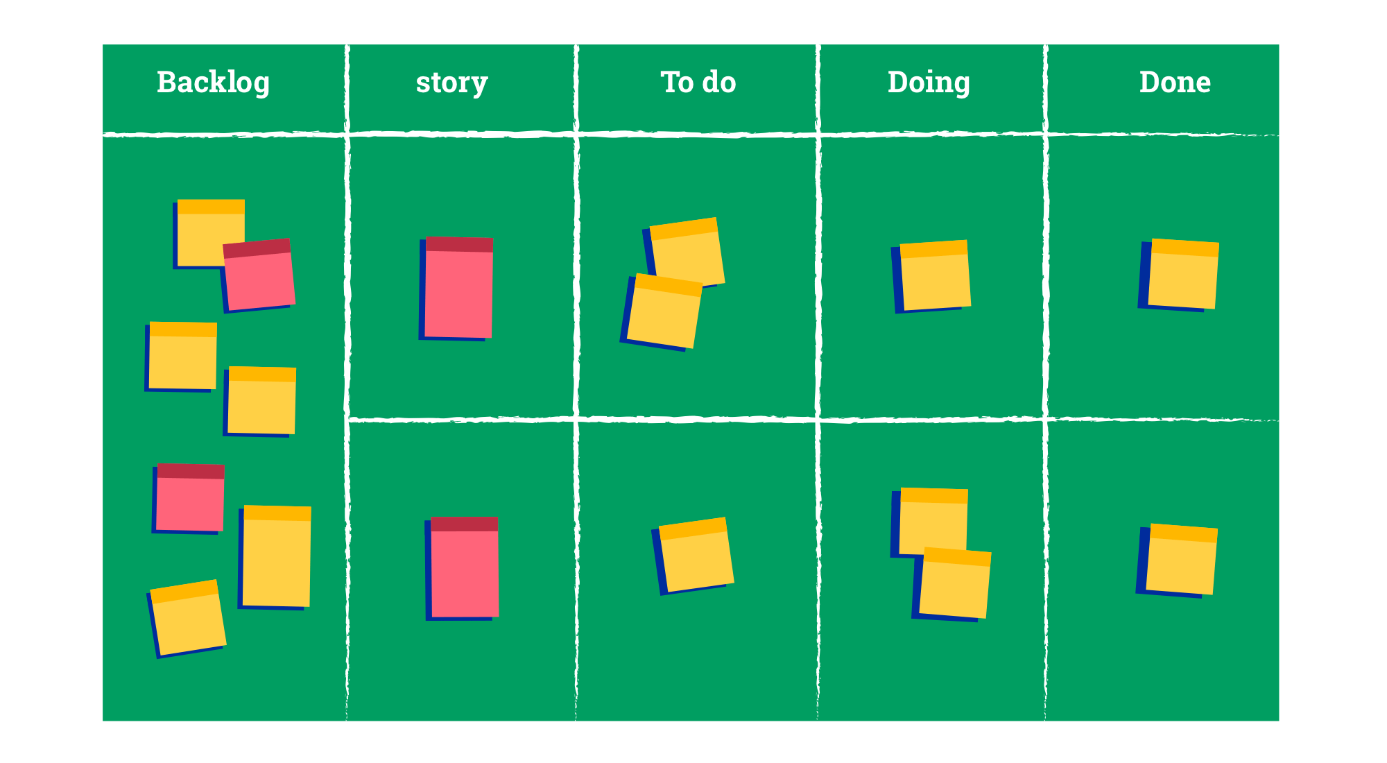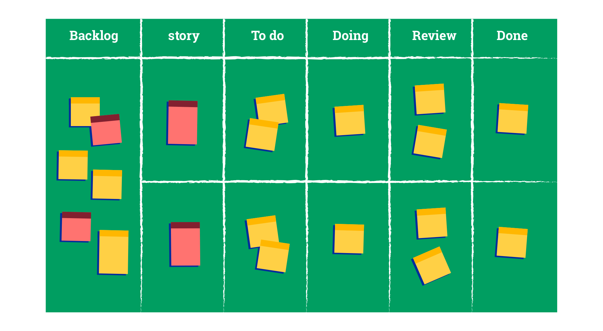 The Scrum task board is divided into columns, each column representing a distinct stage of the work process. For example, you might have columns labeled "To-do" (tasks to start), "In progress" (tasks being worked on), and "Done" (completed tasks). Each card or sticky note on the board represents the specific tasks your team needs to complete during the sprint. As these tasks progress, the cards are shifted from one column to another. The Scrum board provides your team with a comprehensive overview of the sprint's progression and the tasks still pending to complete.