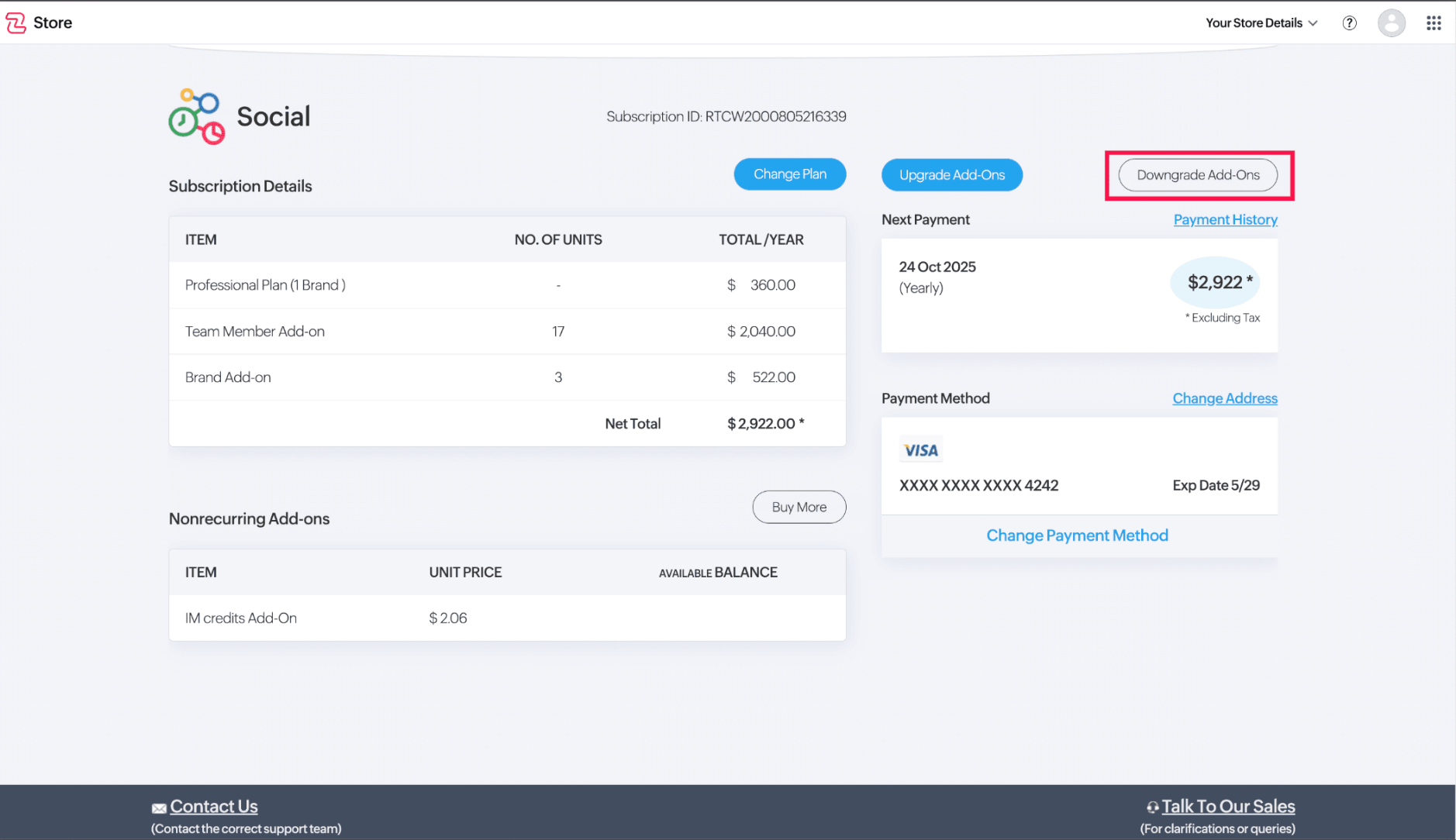 If certain add-ons are no longer necessary for your current usage, you have the flexibility to downgrade them at any time. This allows you to optimize your subscription by removing unused features while ensuring cost efficiency. Downgrading add-ons can help streamline your plan, preventing unnecessary chanrges and keeping your subscription aligned with your evolving needs. Follow the steps below to seamlessly reduce or remove add-ons from your subscription while maintaining uninterrupted access to essential services.