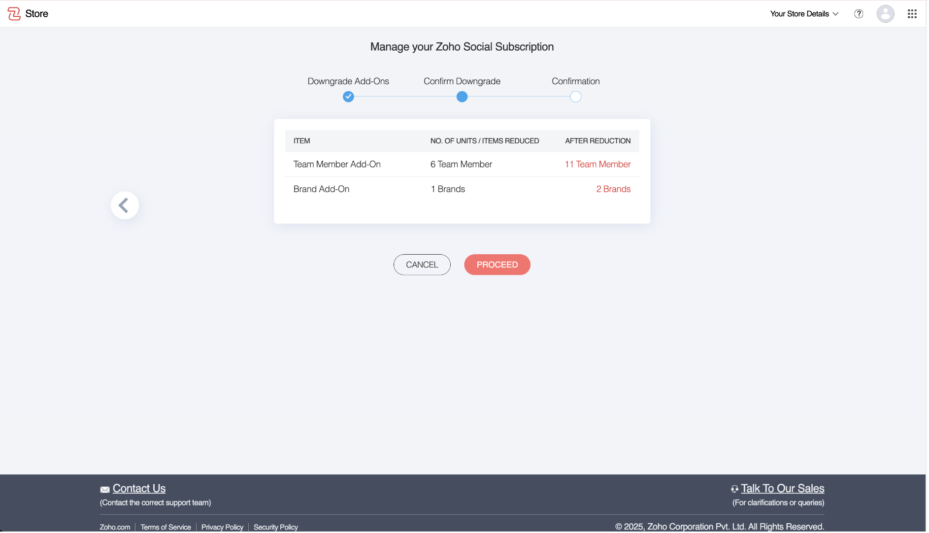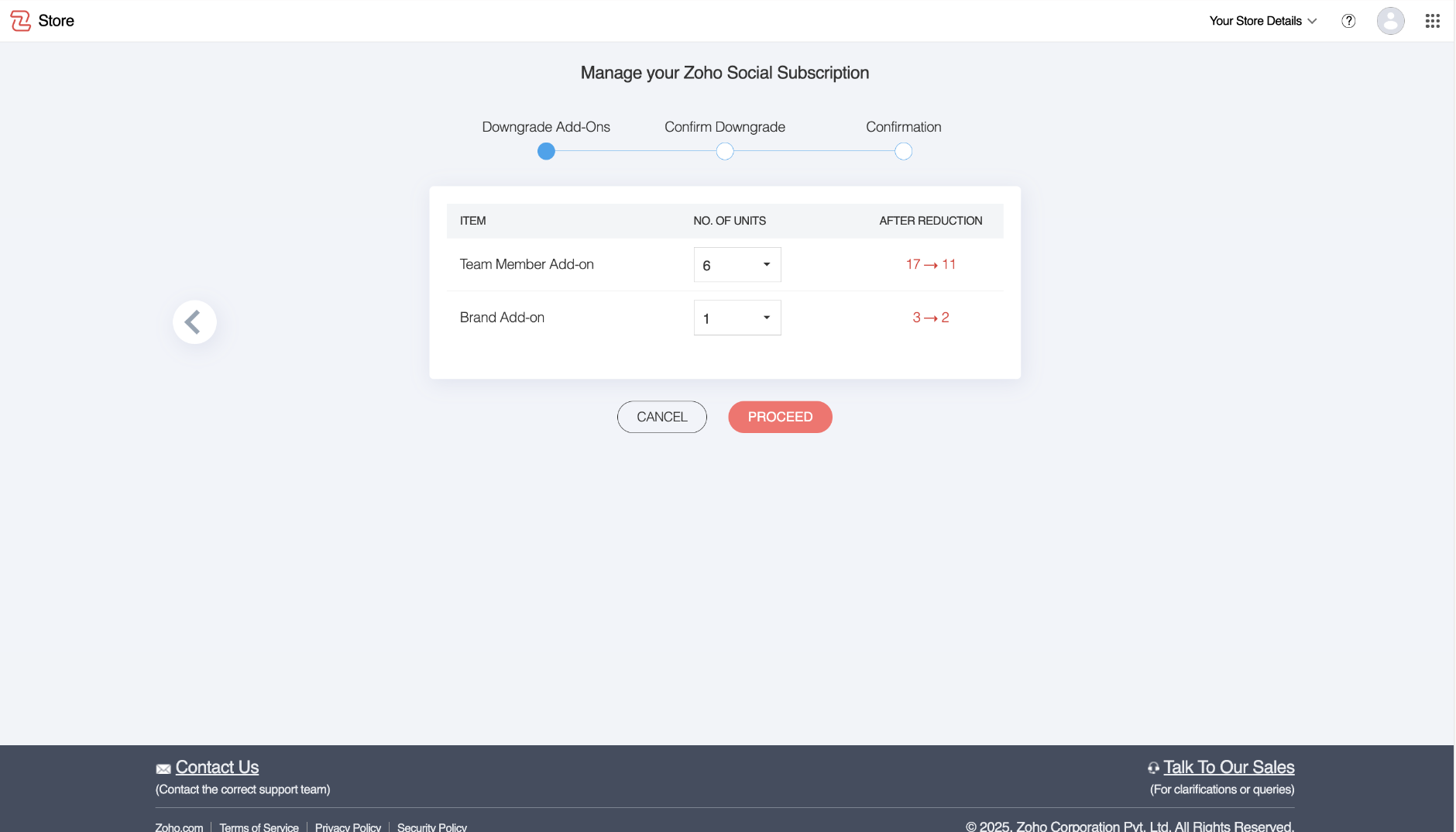 - Confirm Changes - Review the downgrade request to ensure the correct number of add-ons has been selected, then click Proceed again.