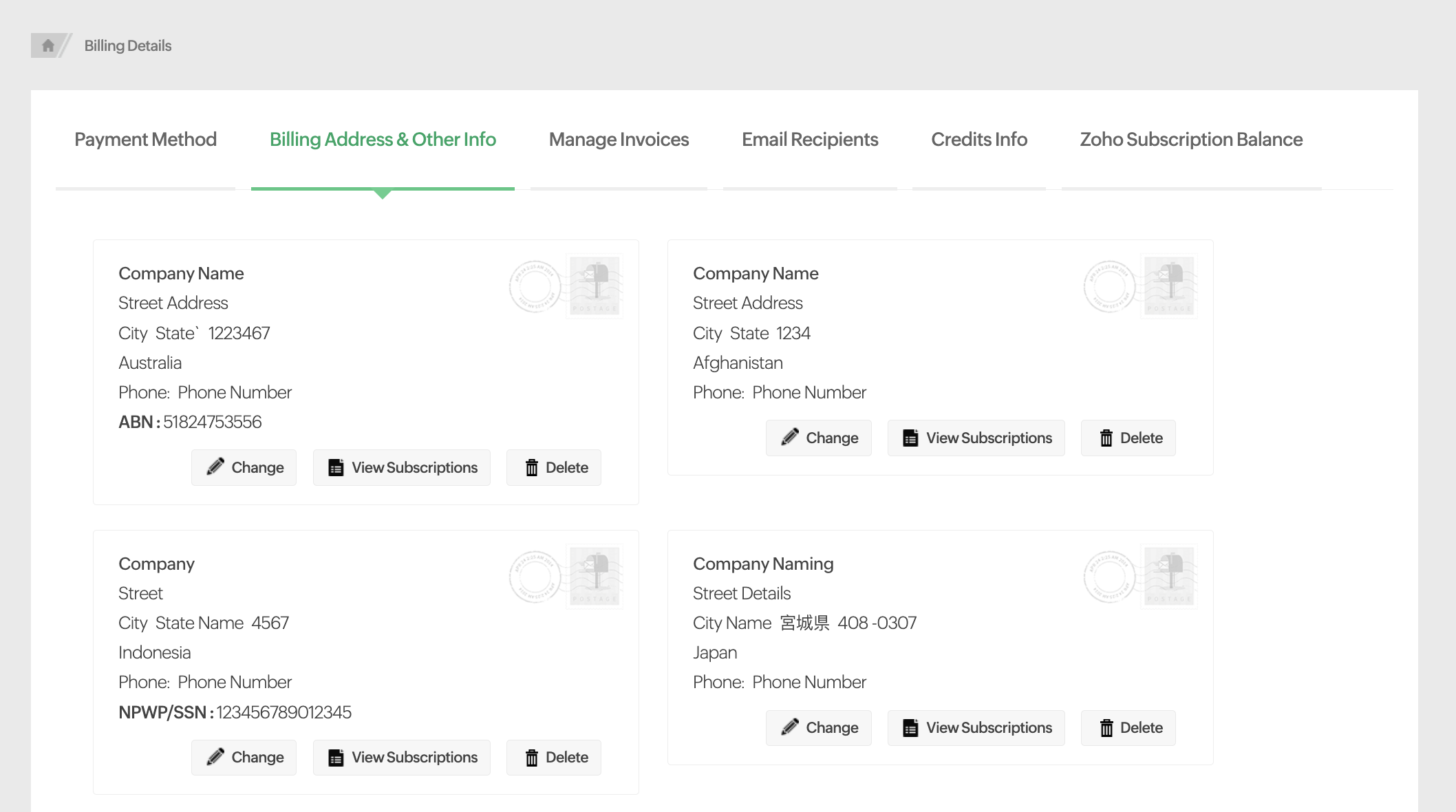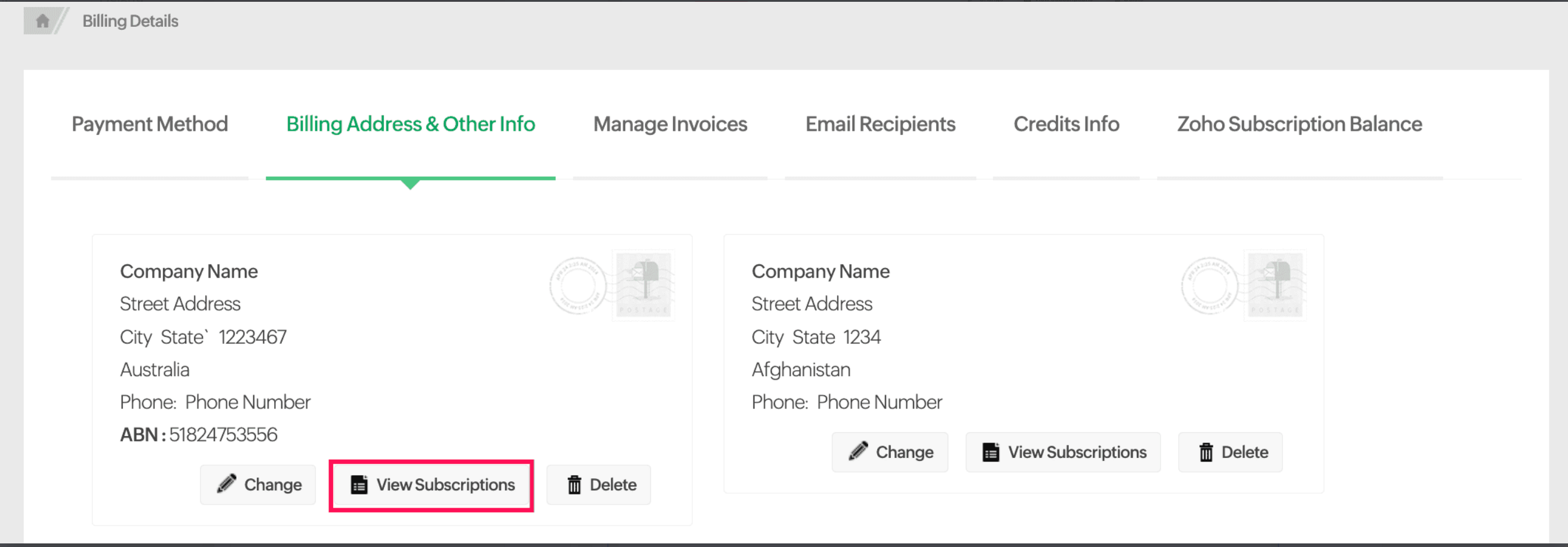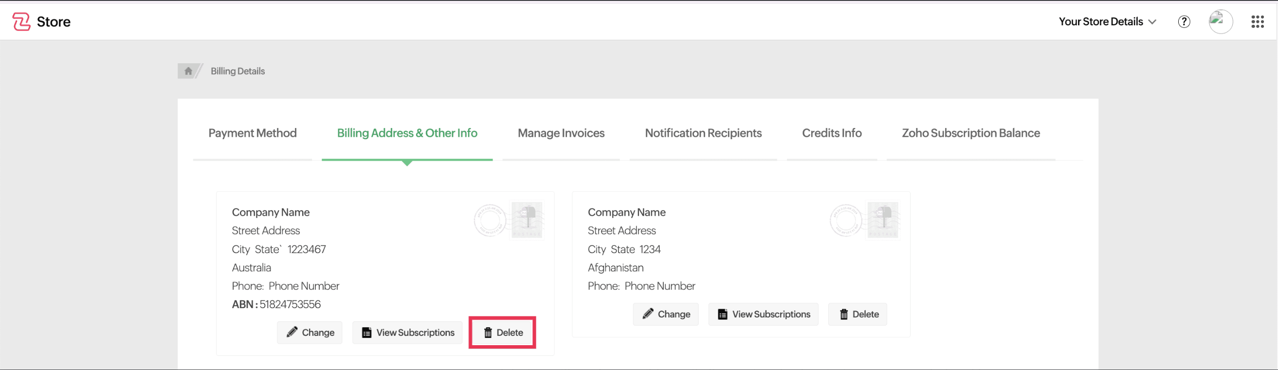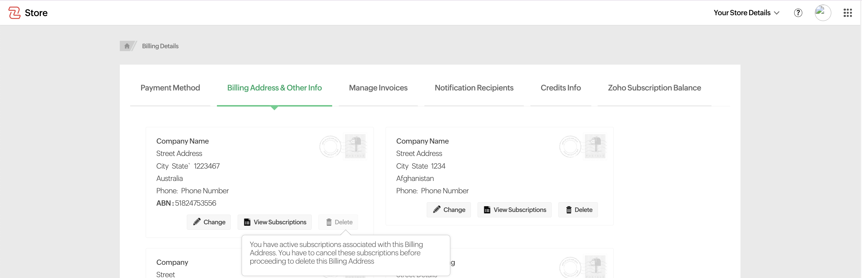 You can remove a billing address using the Delete option. However, deletion is not possible if the address is linked to active subscriptions.