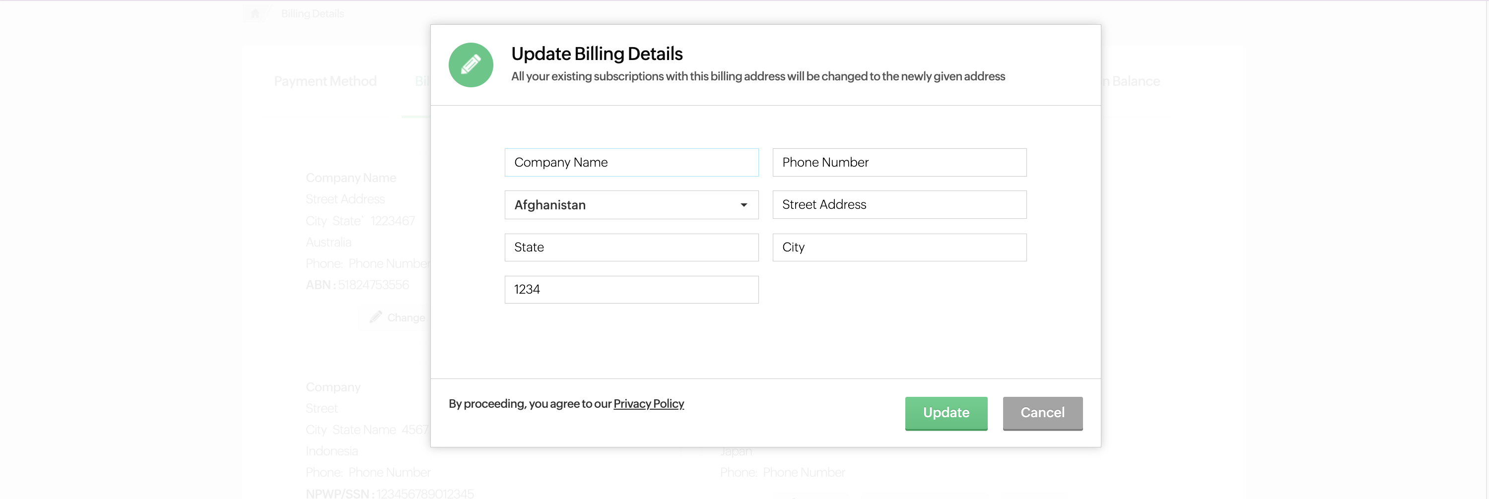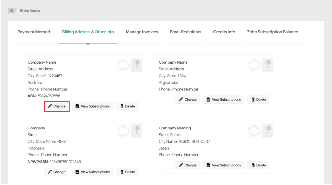 - Click on the change button to update your Billing Address Details.