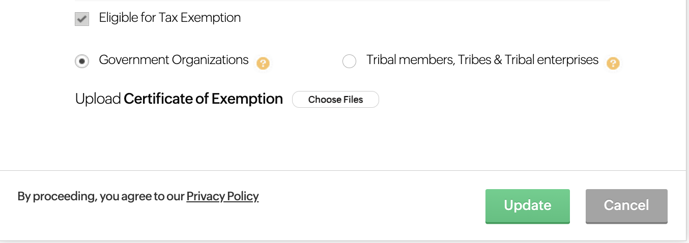 If you are eligible for Tax Exemption, you can submit the necessary documentation while updating your billing address.
