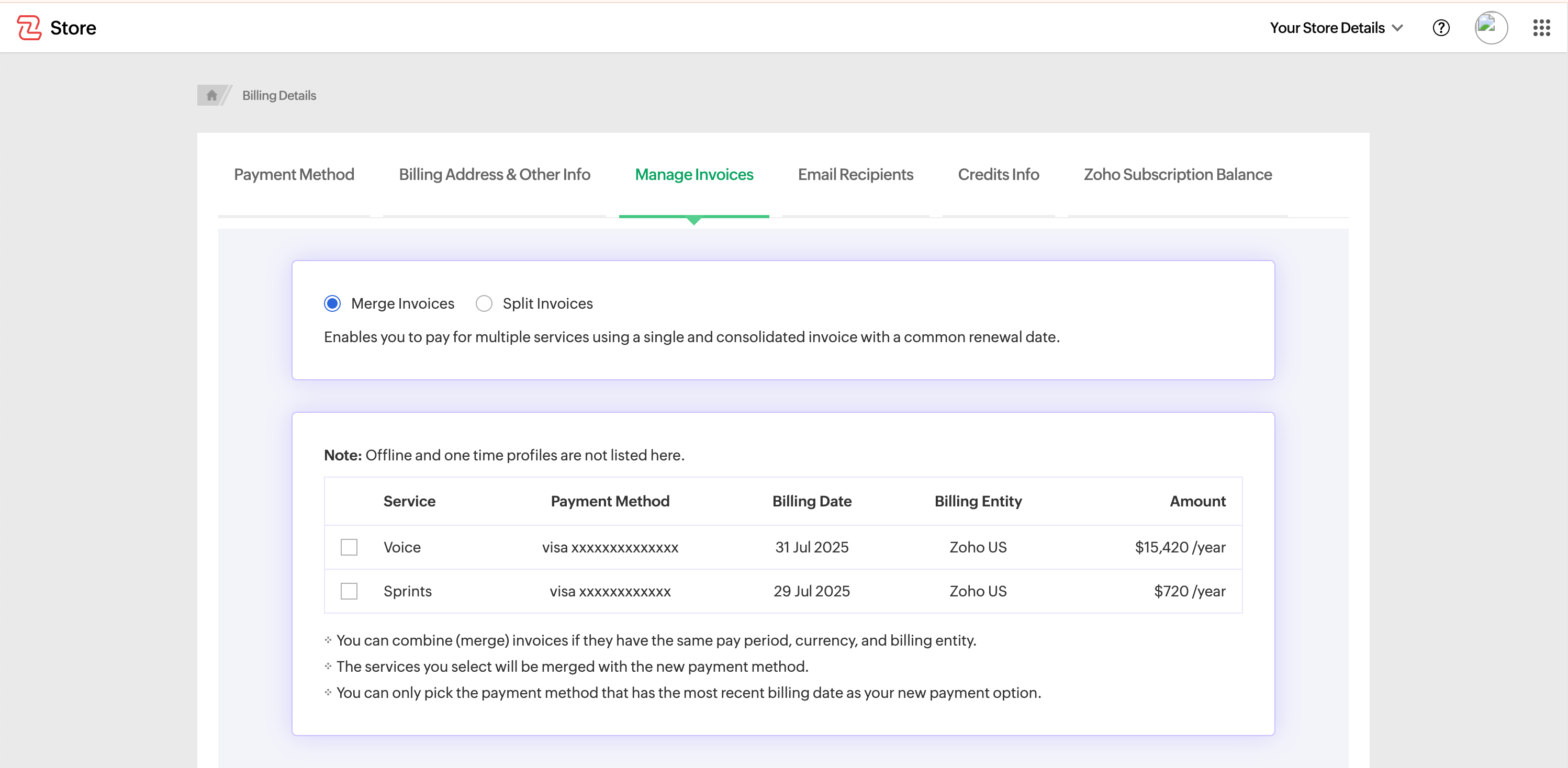 To simplify the invoicing process, we have introduced a new feature on the Store page called Manage Invoices. This feature enables you to consolidate multiple invoices into a single document, making it easier to manage and track your payments.
