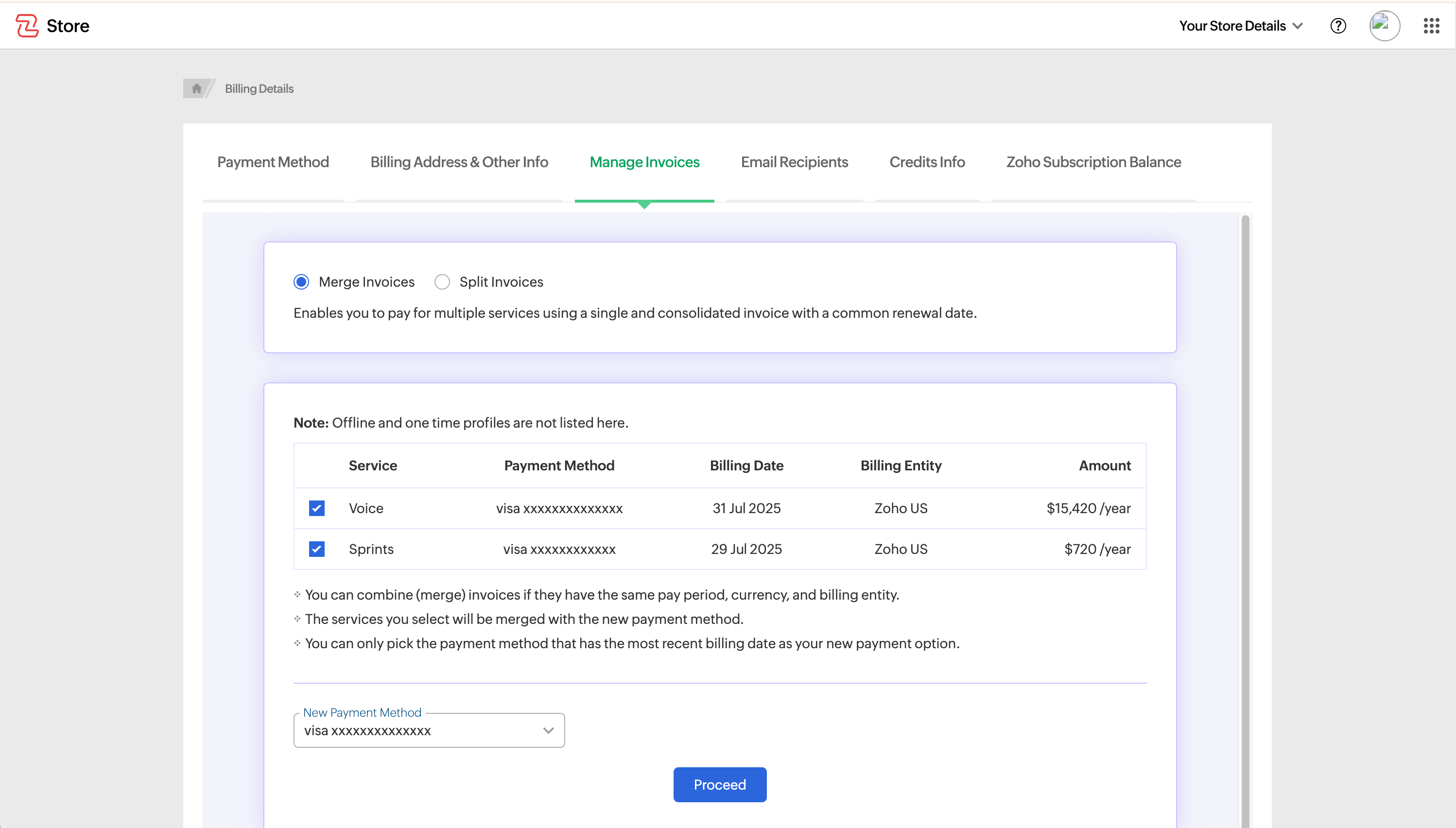 When merging invoices, you will need to select a new payment method for the consolidated invoice.