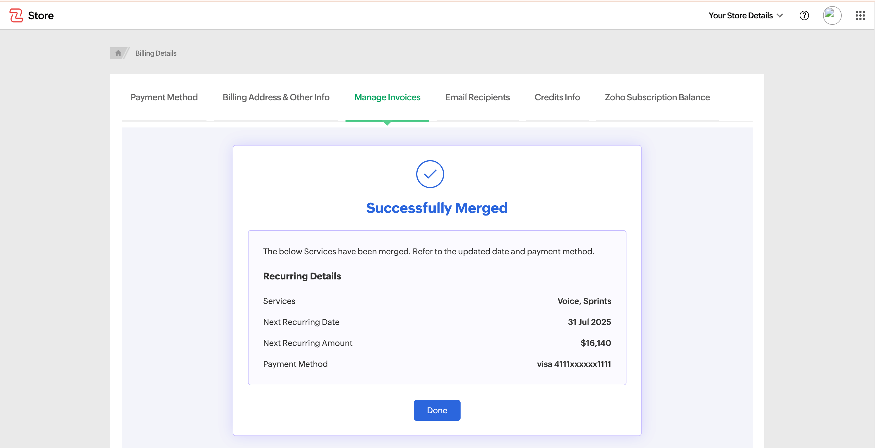 After merging, the Next Renewal Date will be set according to the latest billing cycle of the selected invoices.