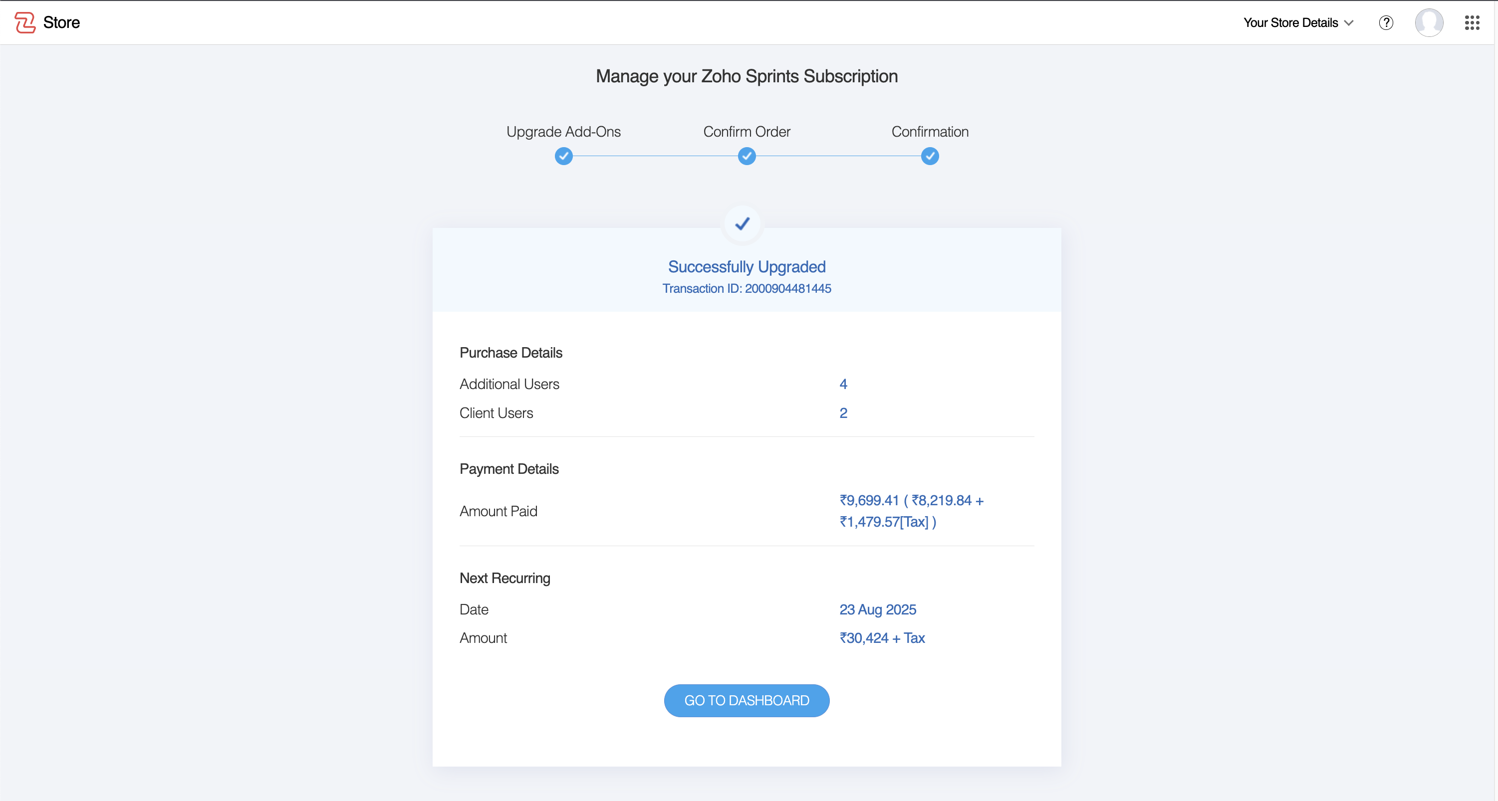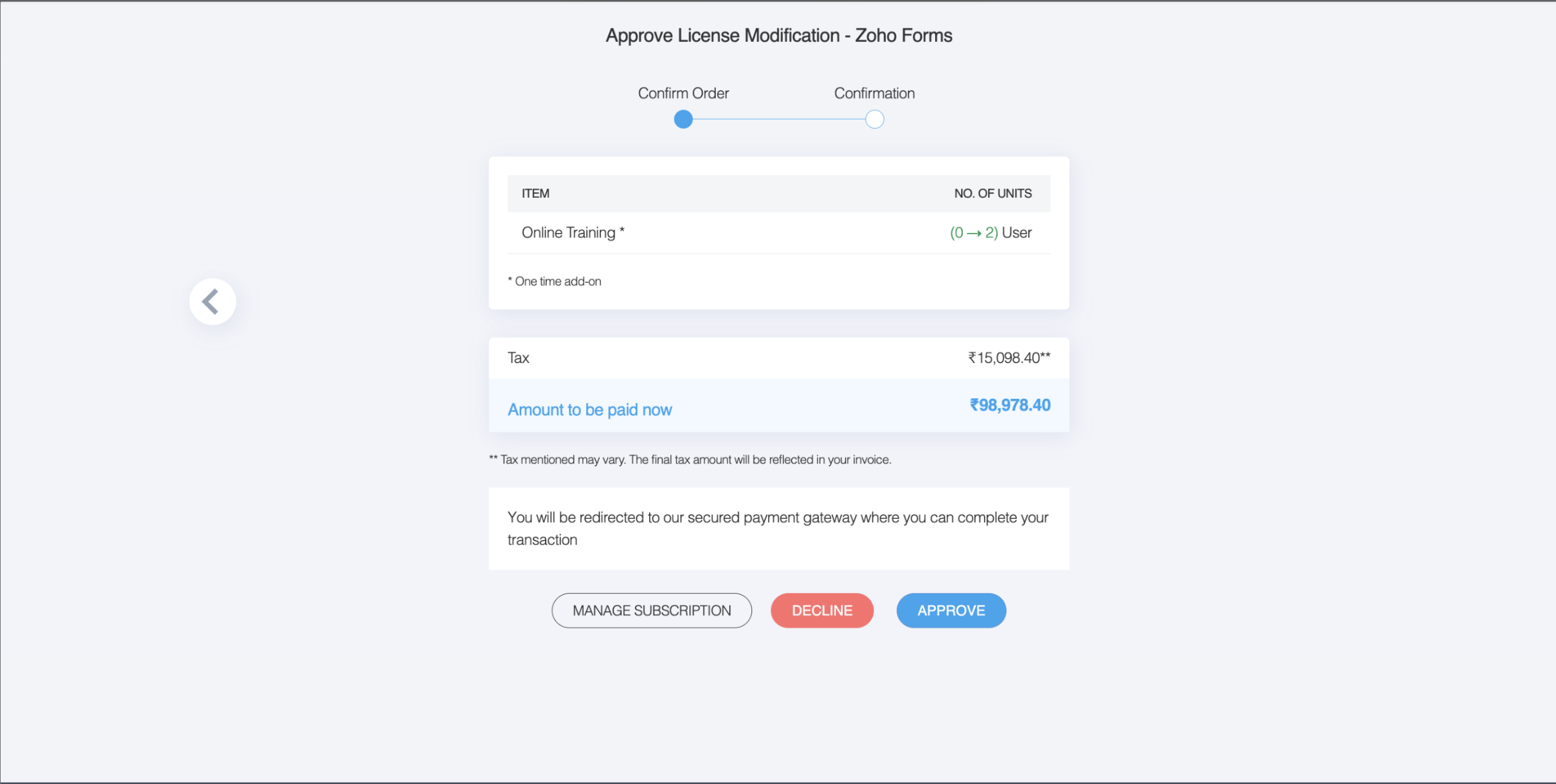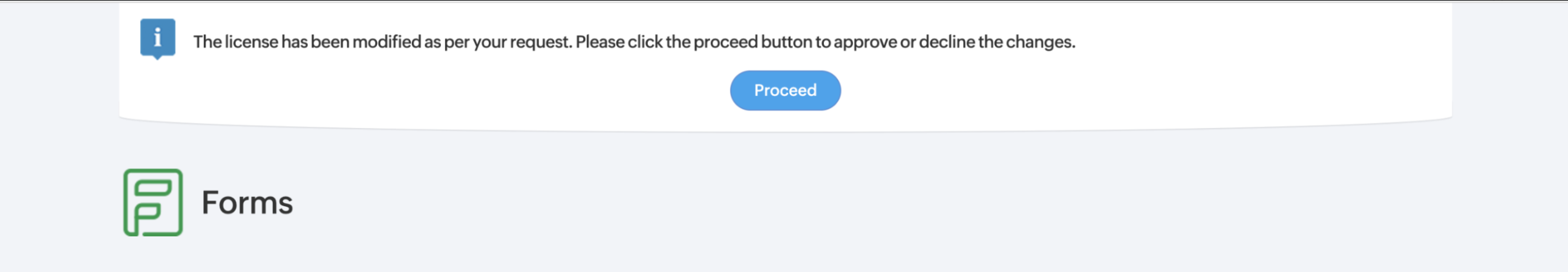Customers can review and take action on license modifications directly from the Zoho Store - Manage Subscription page. This can be accessed in two ways: