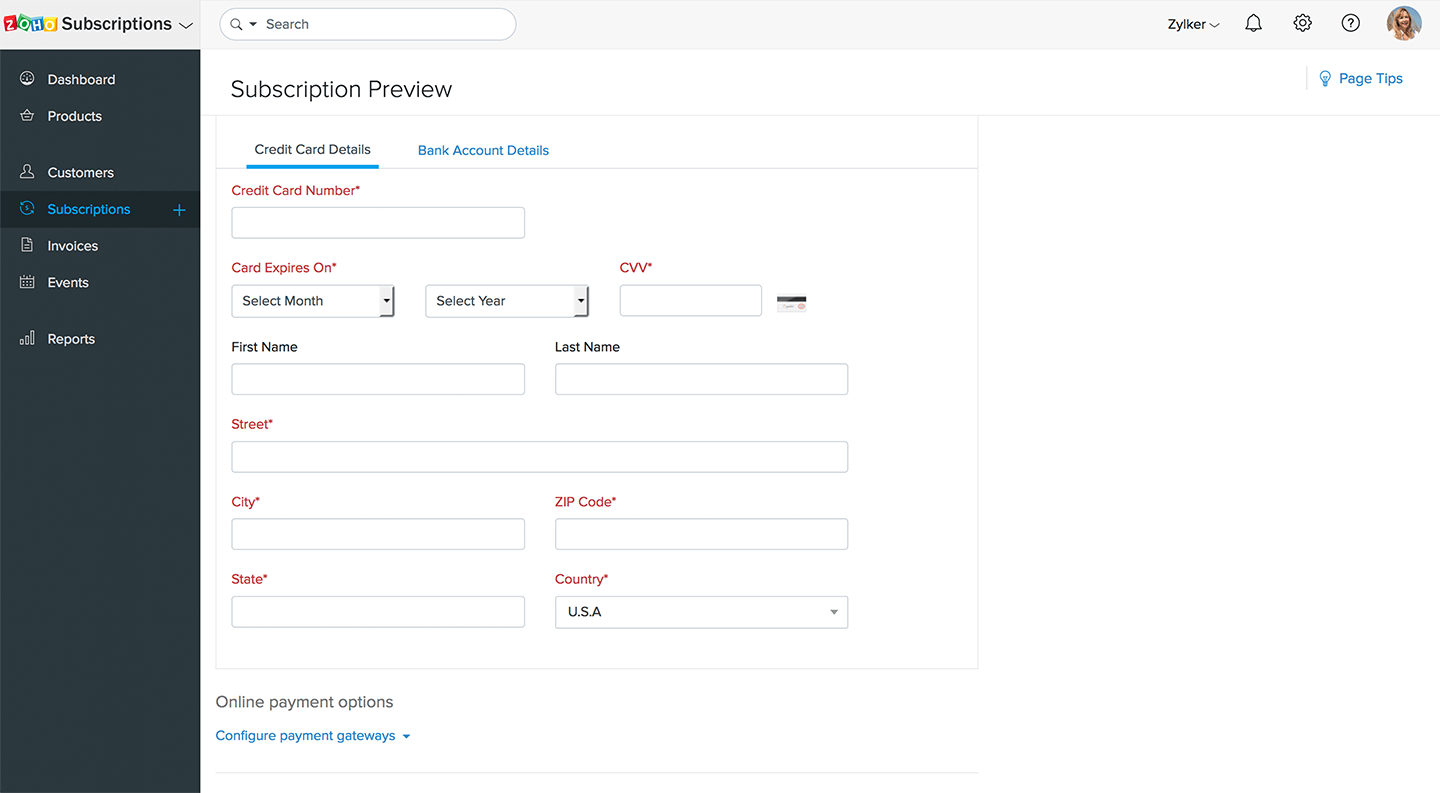 Preview of Zoho Billing's secure PCI-DSS compliant hosted payment page