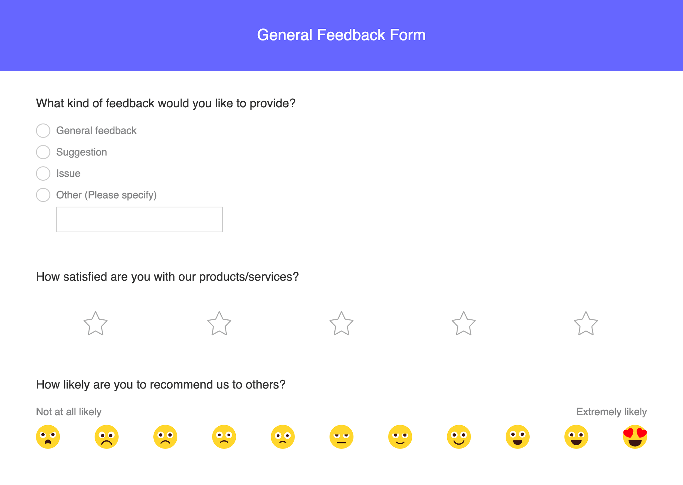 By giving customers a quick way to share their thoughts, a general feedback form helps you spot recurring issues, discover new ideas, and fine-tune your offering based on real input.
