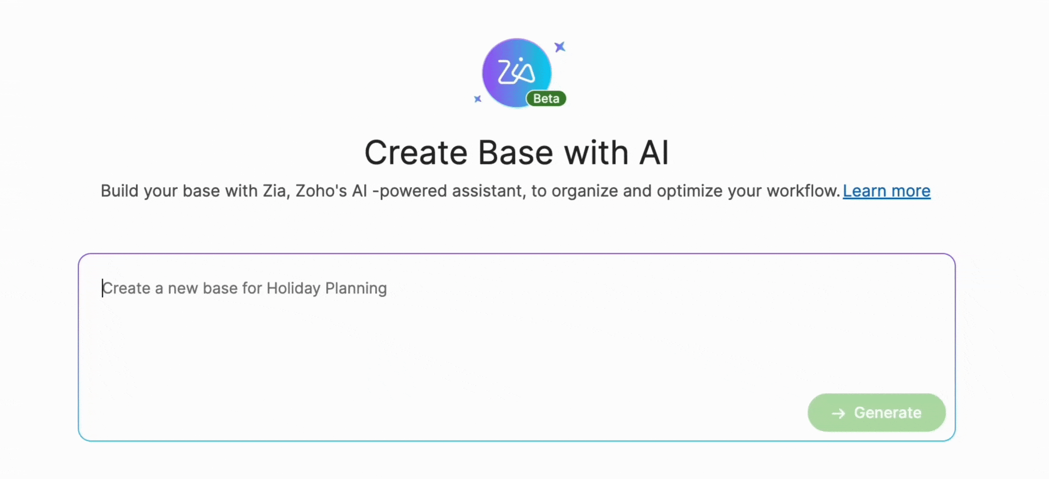 Microsoft Lists comes with a set of templates for different use cases. Zoho Tables, on the other hand, offers both templates and AI assistance for users to get started within seconds. Zoho's AI assistant, Zia, suggests a list of tables based on the user's prompt. Once the user selects the tables they need, Zia creates a lightweight solution with sample data and linked tables for their use case, saving the user time and effort.