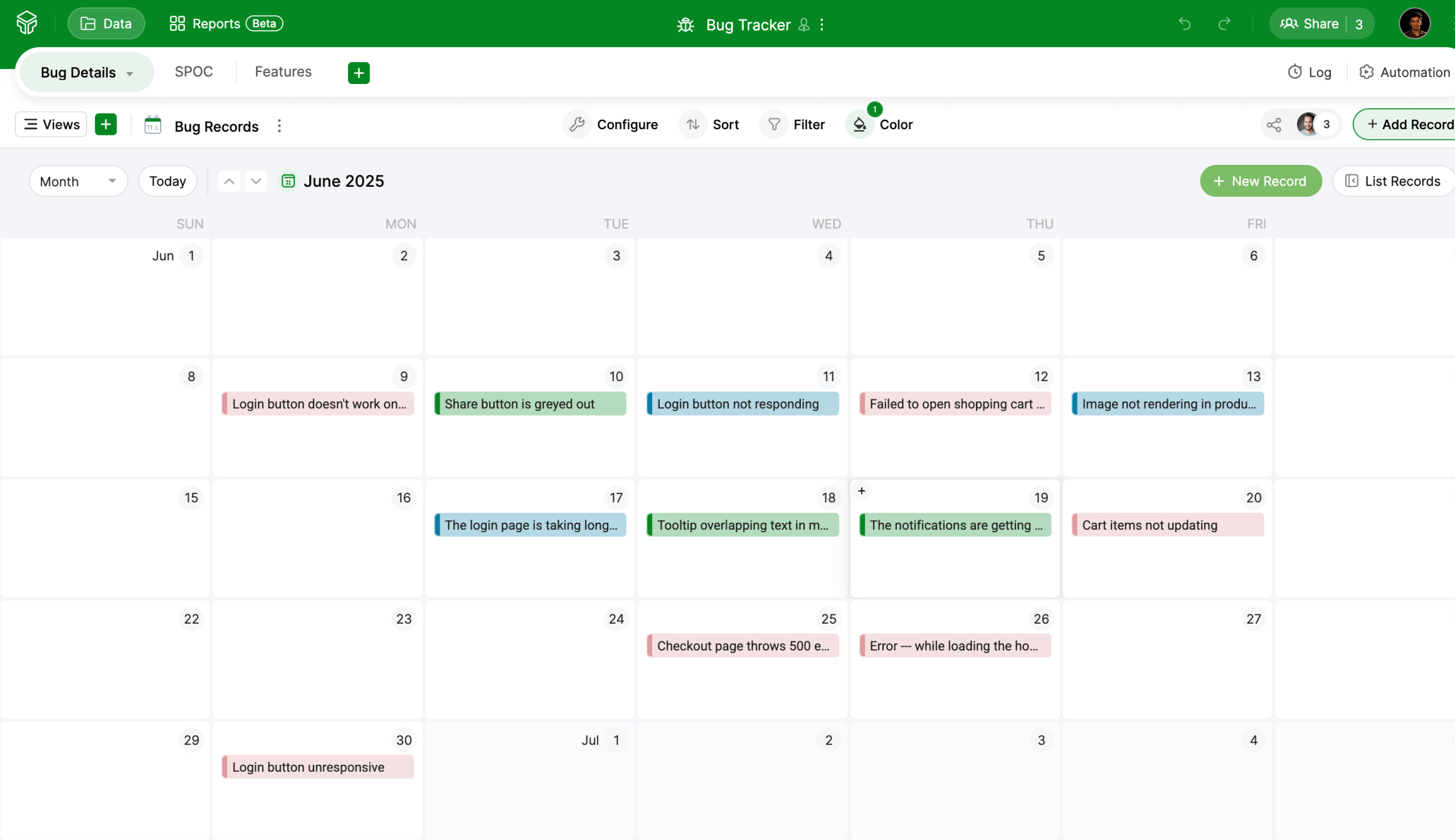 Spreadsheets have limited data views. For example, it's hard to consume data in grids as opposed to kanban cards that display the status of bugs, a calendar to view bugs reported and resolved dates, or a gallery of bug screenshots.
