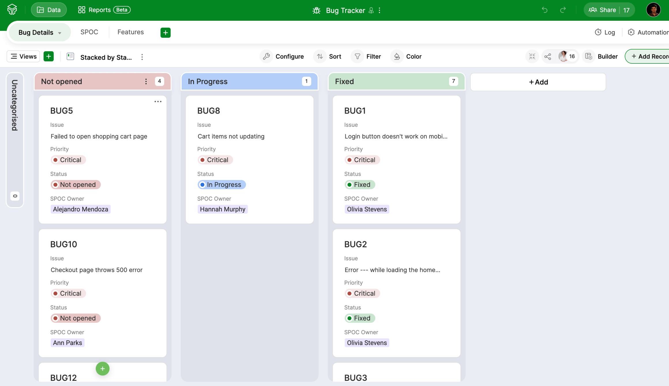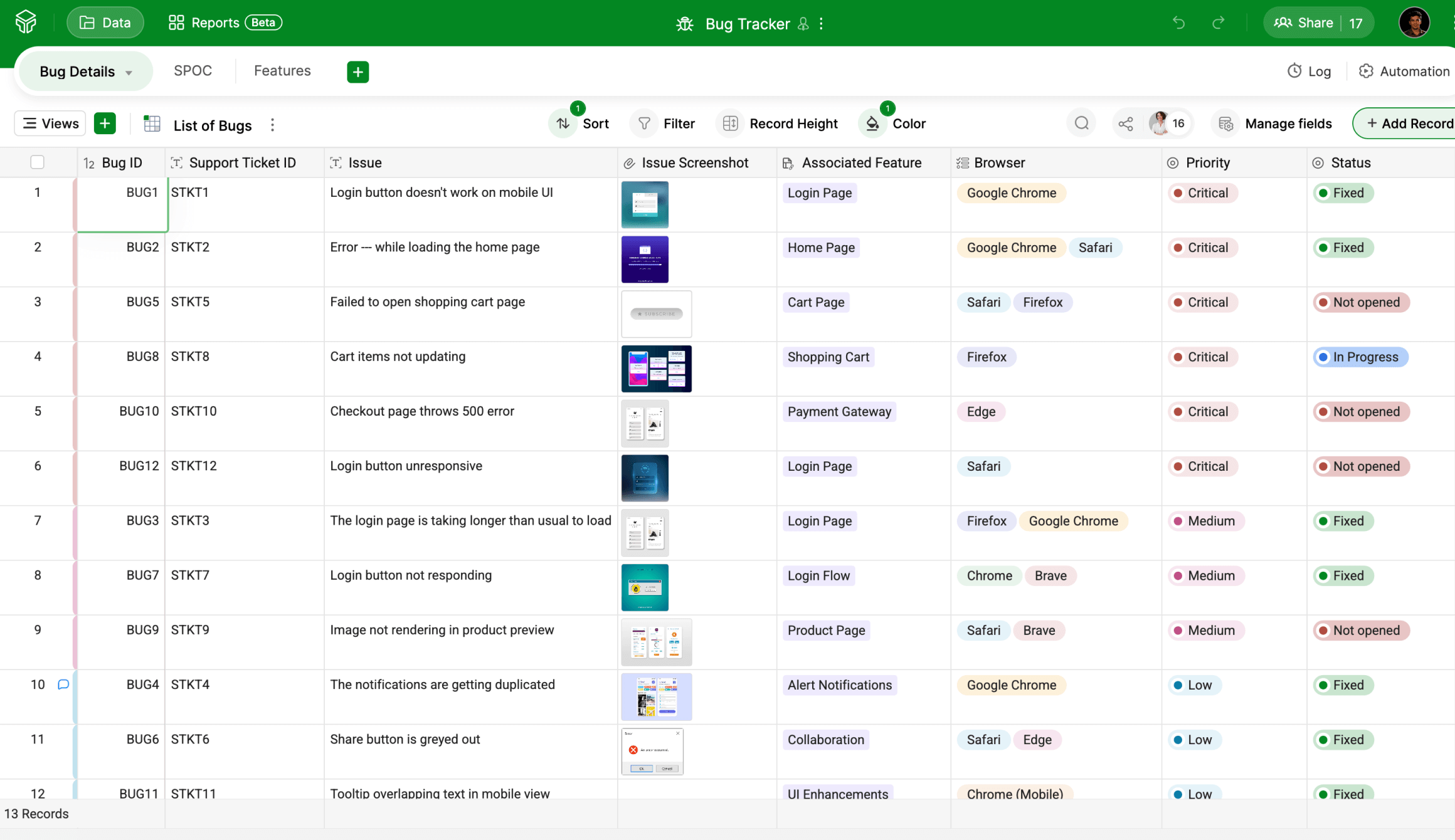 Spreadsheets involve a lot of back-and-forth switching between tabs to track data. For example, there will be no relationship between a tab that has a list of bugs and another tab with SPOCs assigned to these bugs. Users have to rely on various formulas, like VLOOKUP, HLOOKUP, XLOOKUP and INDEX/MATCH—or they have to use external tools like Power BI to create bidirectional relationships.