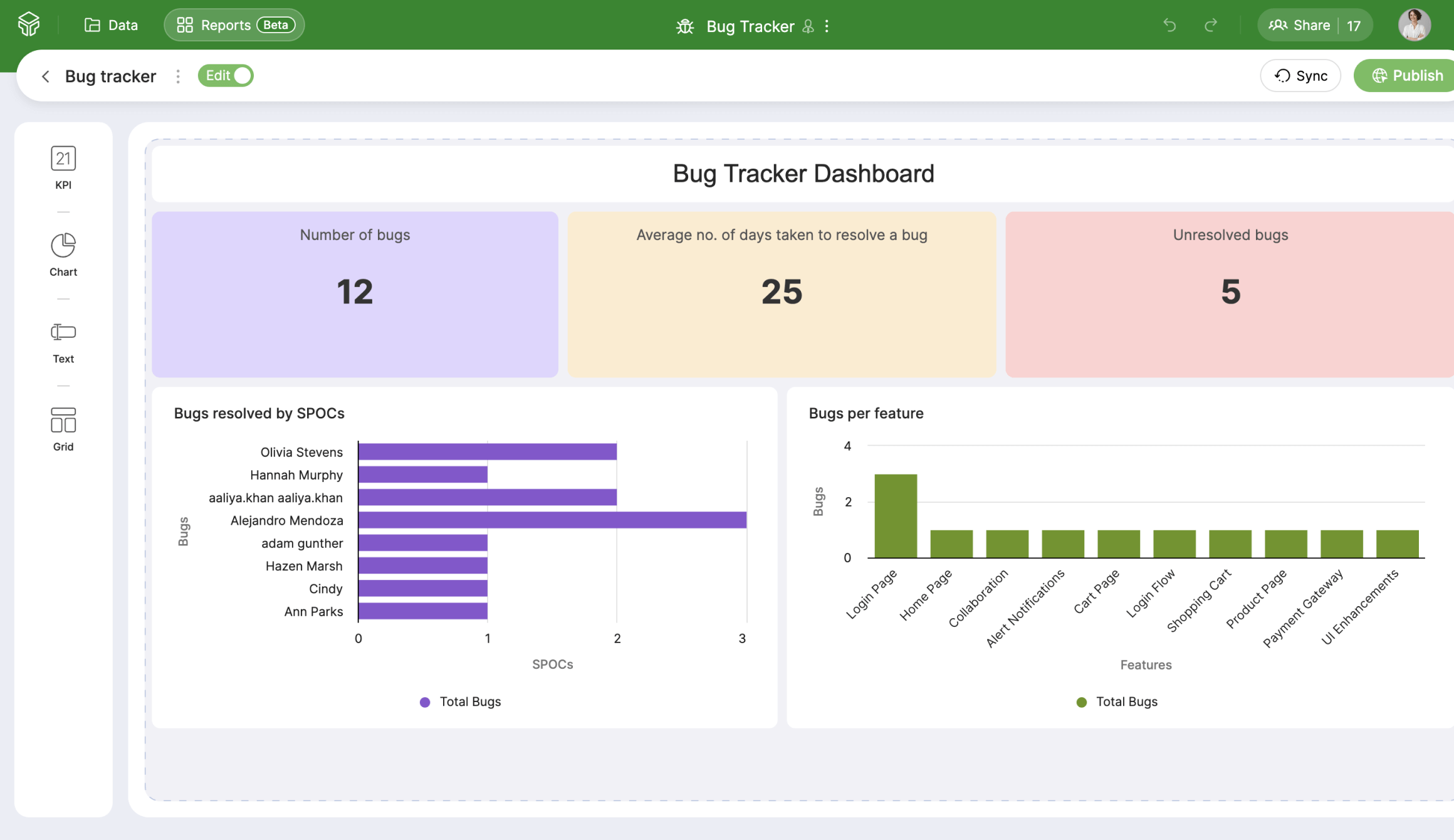 Get a holistic view of the number of bugs reported weekly, features that ran into the most issues, and work distribution across SPOCs.