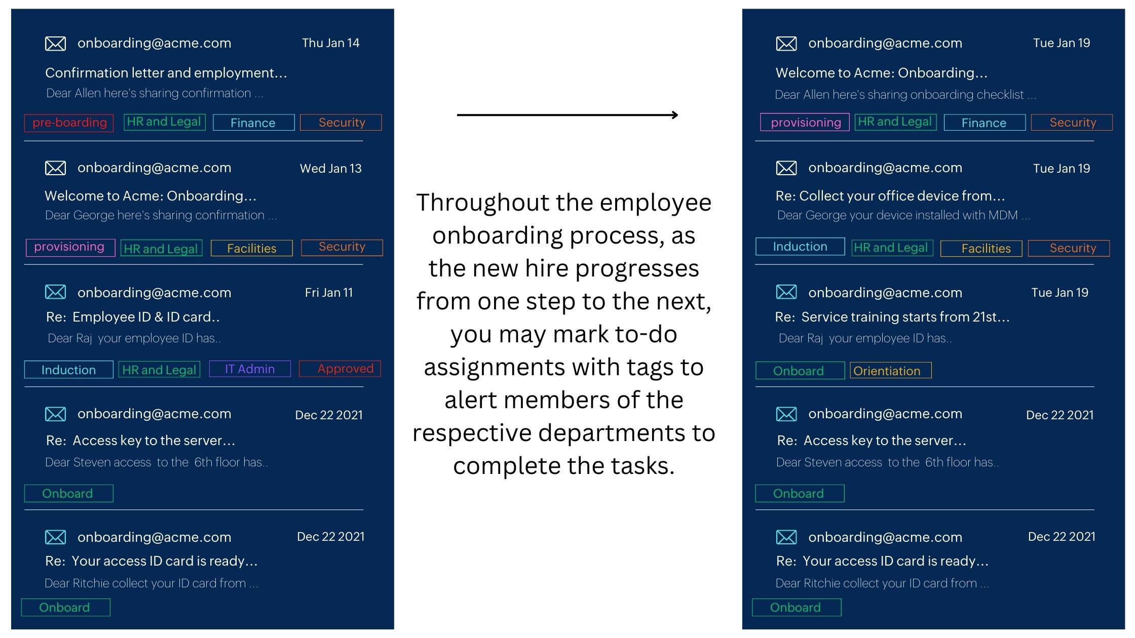 As the employee onboarding process progresses from step to step, the administrator may mark to-do assignments with tags to notify the appropriate departments to execute their tasks.