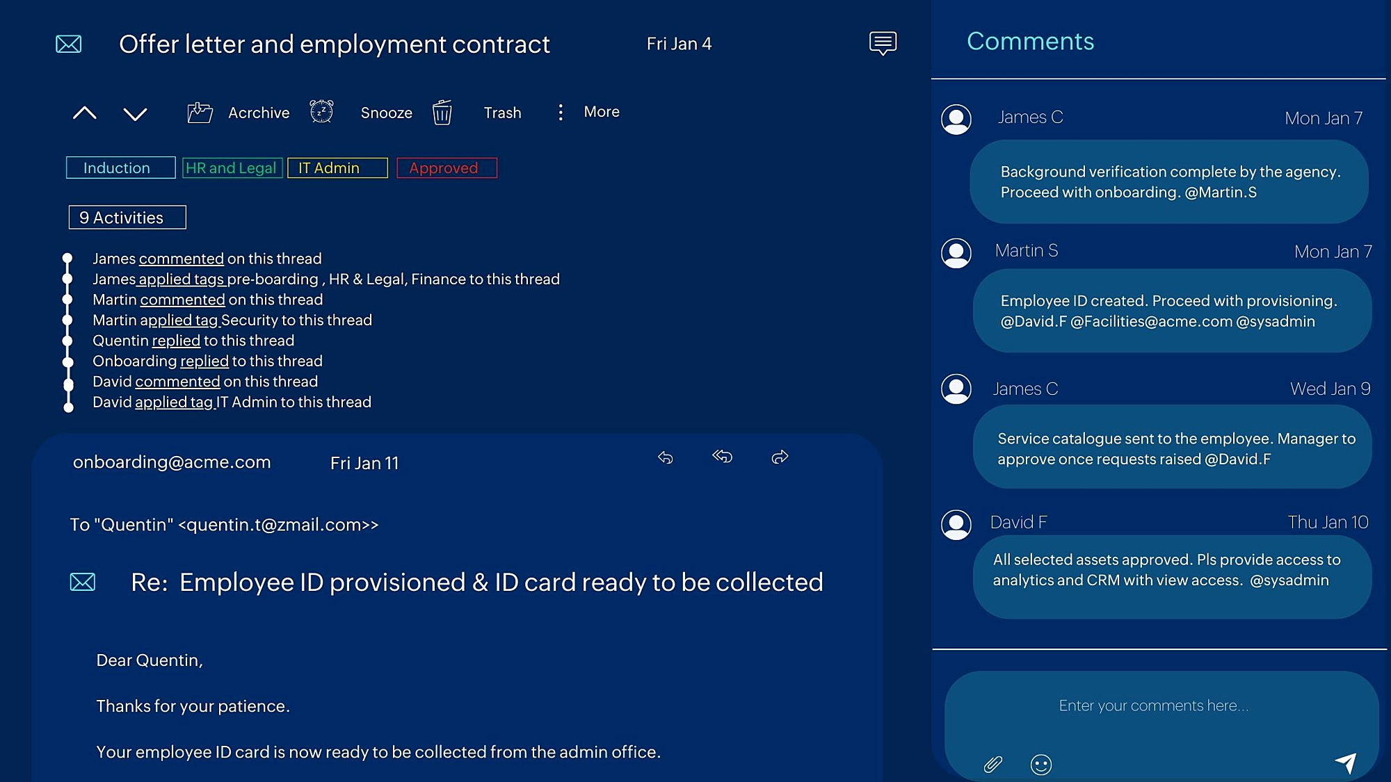 The best aspect of the shared inbox is that, with capabilities such as group email management, predefined templates, automation rules, color-coded tags, analytics, integration, and more, the tool can be tailored to the organization's defined employee onboarding process.