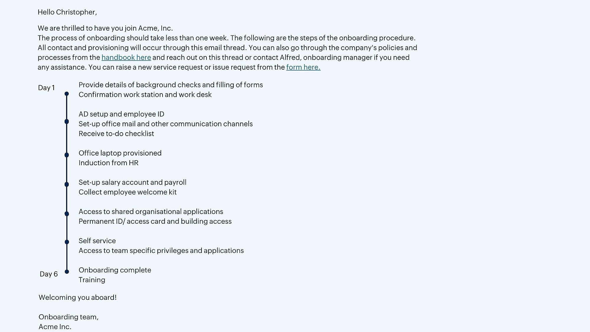 For instance, the administrator can create a welcome email with a checklist of all deliverables and activities to be completed, as well as all of the relevant links the new employee will need.