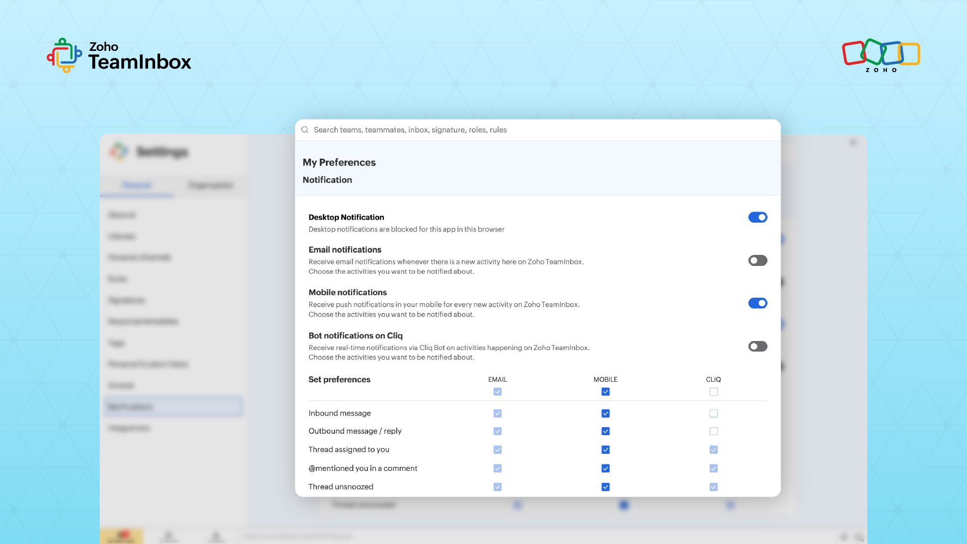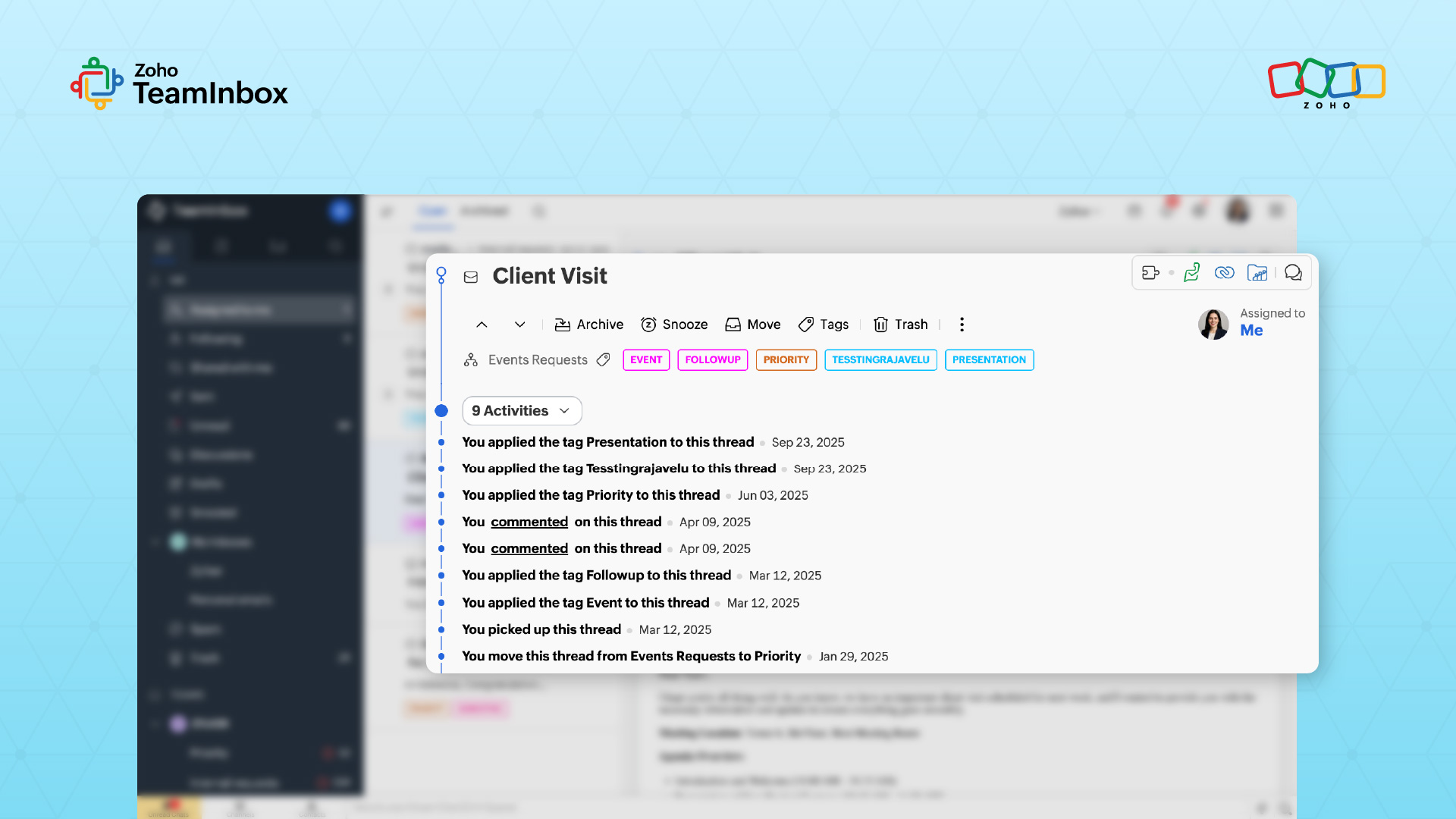Shared mailbox workflows reduce that friction by embedding timing signals directly into the inbox. Zoho TeamInbox supports this with notification features like snooze and follow, allowing teams to resurface conversations at the right time without manual reminders.