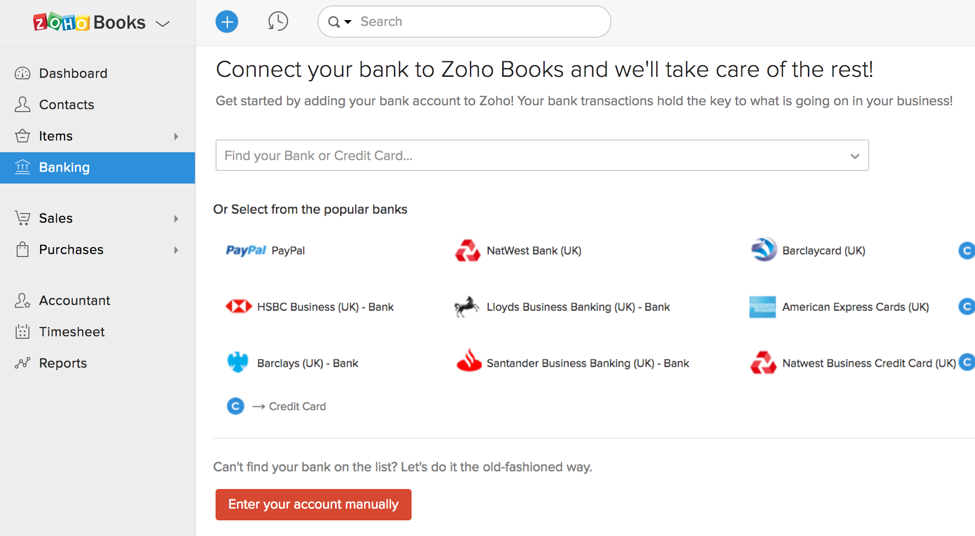 In Zoho Books, you can add your bank and credit account details, so that your payments through them can be accounted for precisely. When importing your chart of accounts, if you had included these details in your import file, they will be available in the Banking module. If not, you can add them manually as well. Here’s how: