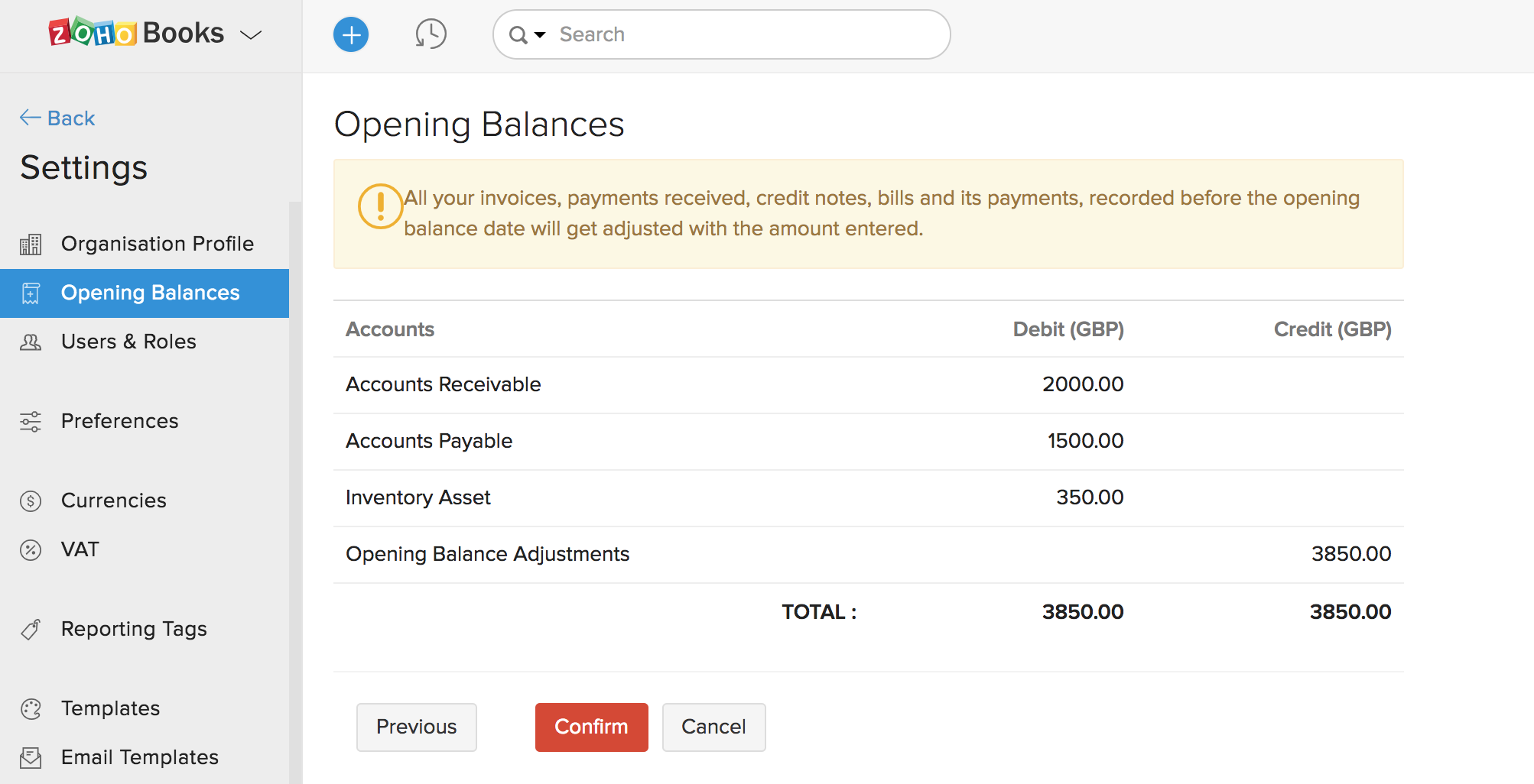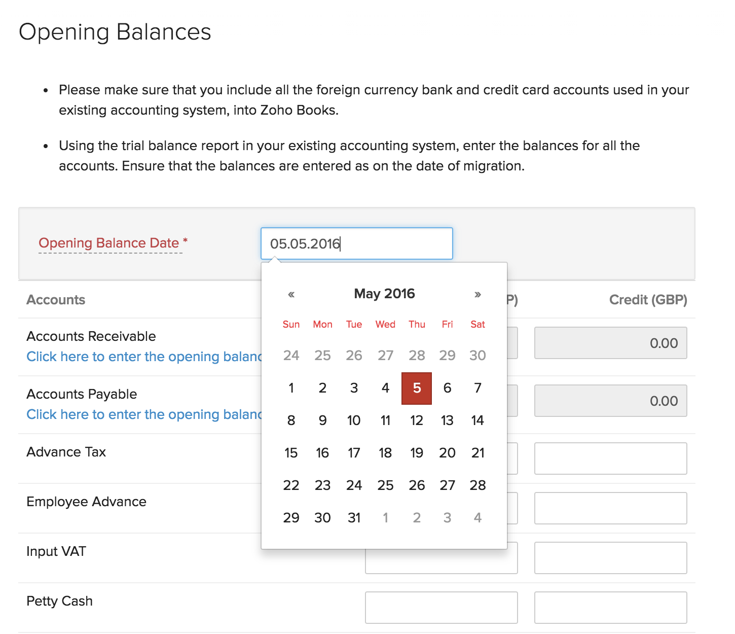 Opening Balances is the amount you have in the different accounts of your business at the start of an accounting period, or when switching to a new accounting system. When switching from your previous system, you need to ensure that all your accounts and their balances are brought into Zoho Books.