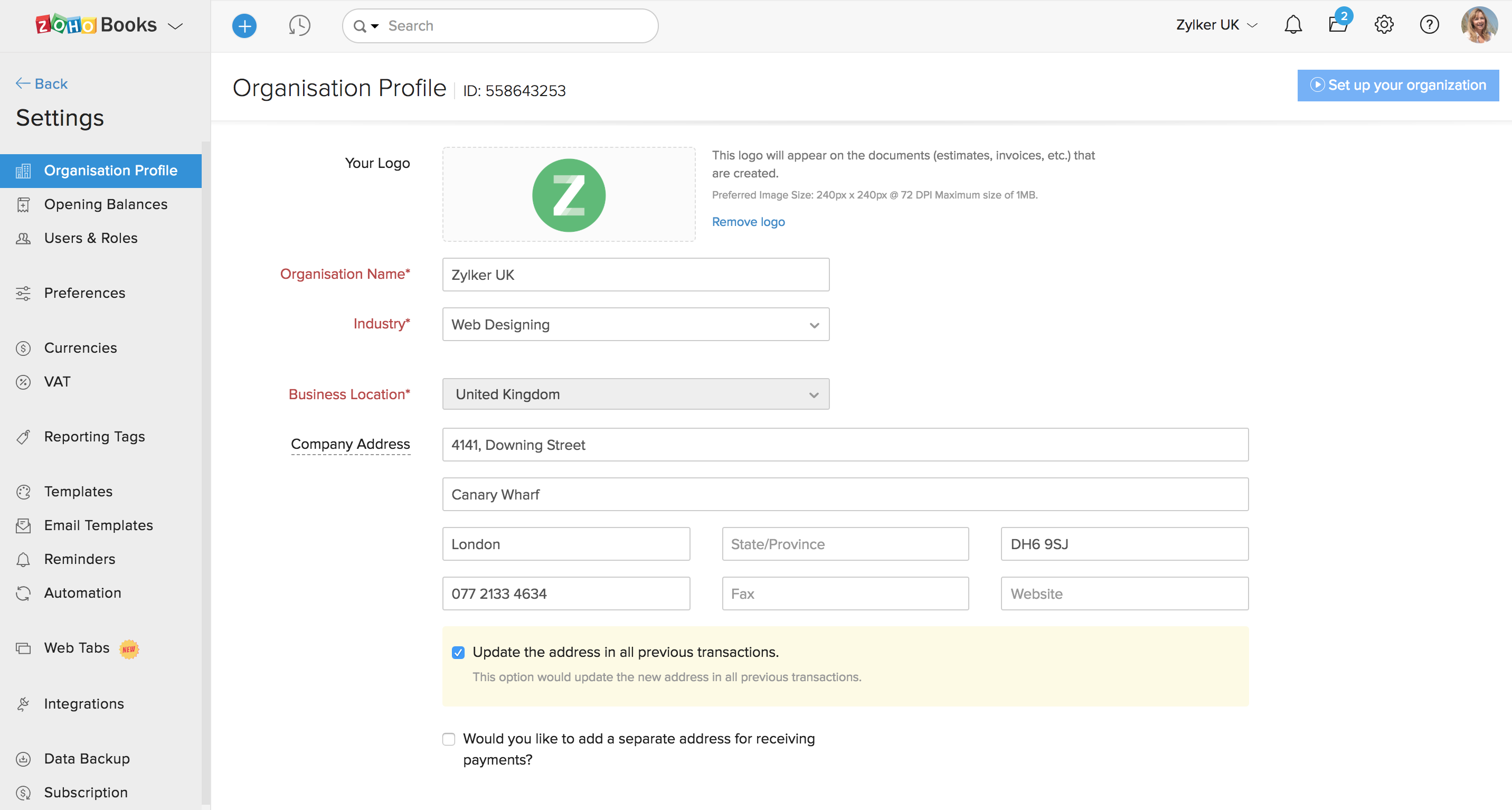 Now that you have the required data ready to import, you can start setting up your Zoho Books organization. After you sign up to Zoho Books, you have to fill up your organization’s details. To do this: