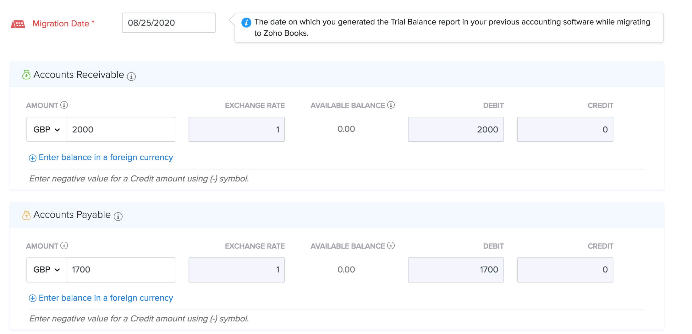 If you’re switching to Zoho Books at the end of your financial year, the closing balances of the previous year should be entered as your opening balances for the current year in Zoho Books. If you’re switching to Zoho Books during any other time of the financial year, you can generate a Trial Balance on the date of migration to identify all the debit and credit balances of your accounts.