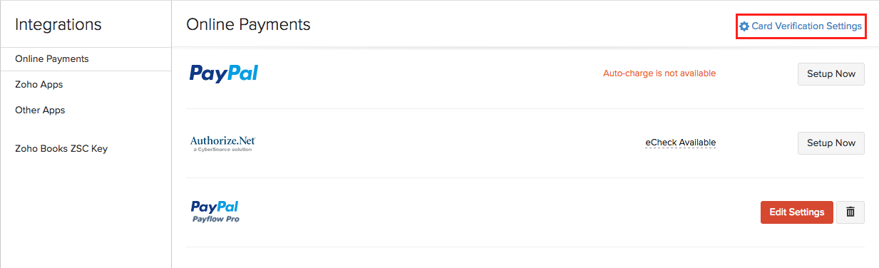 In this section you can configure the online payment settings linked to your Zoho Books account.