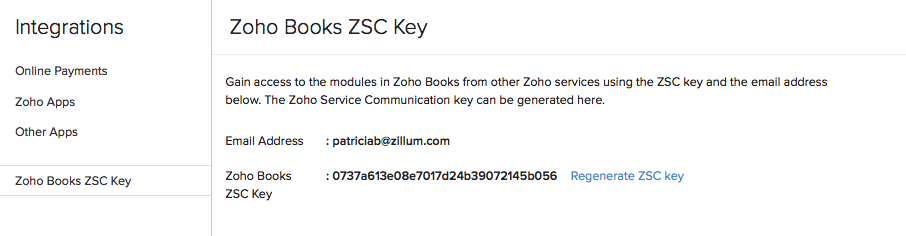 Zoho provides numerous world class apps in addition to Zoho Books, such as Zoho CRM, Zoho Invoice, etc. If you have a Zoho CRM account and would like to integrate with your Zoho Books or Zoho Invoice account, you may use this ZSC key to do so. The ZSC Key is a unique key used to communicate between these apps.