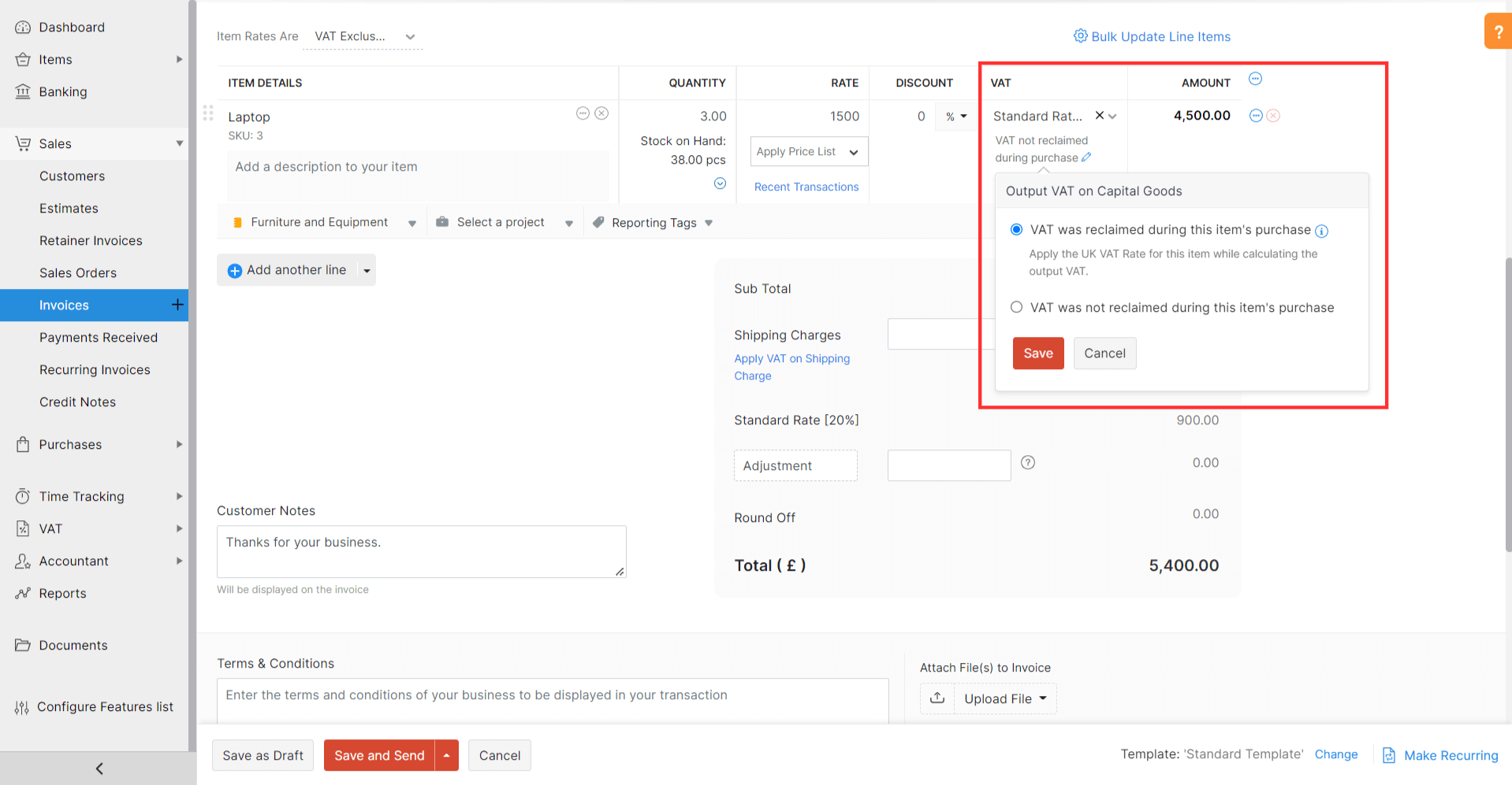 Suppose you’re selling capital expenditure goods, for which you had reclaimed VAT during purchase, to your customers. In that case, you will have to record the same in Zoho Books to calculate the output VAT in the UK VAT rate. Here’s how you can do this:
