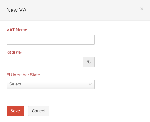 - In the pop-up that follow, enter a VAT Name, Rate(%) and select a EU Member State from the drop-down for the tax you are adding.