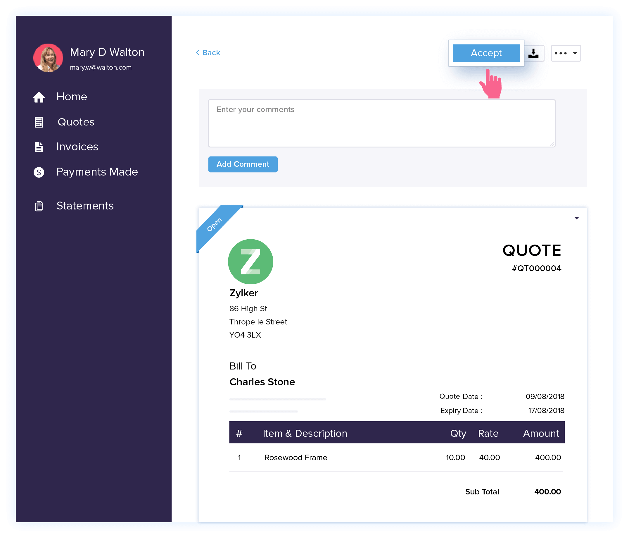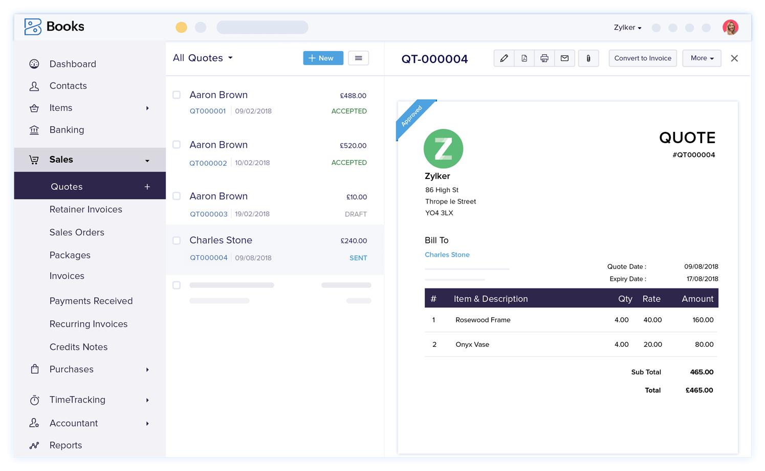 From initial enquiry to final approval, streamline your sales process with professional quotes. Zoho Books helps you create a quote, send it to your customer, track its status, and convert it into an invoice — without switching tools.