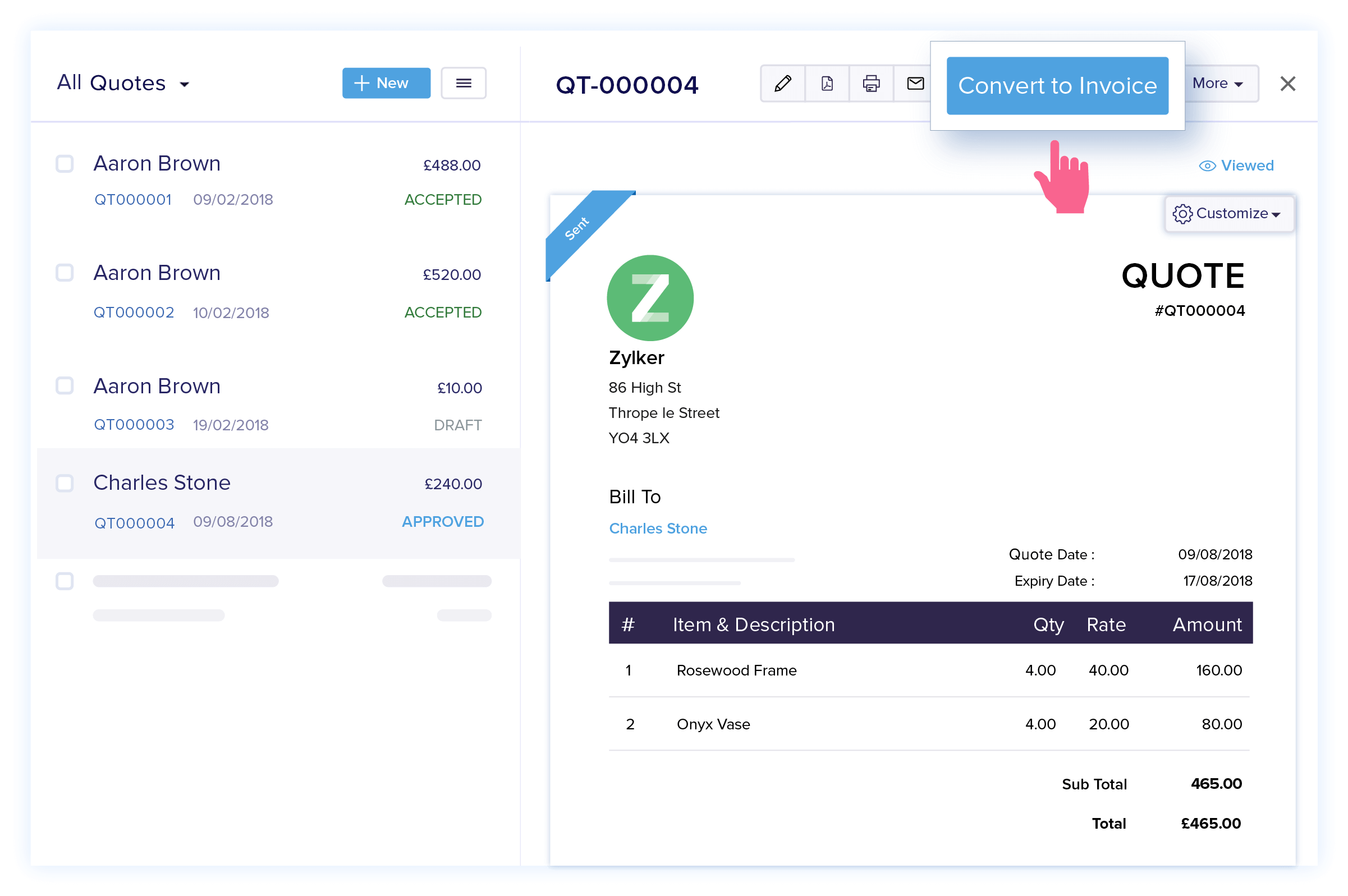Once a quote is approved, turn it into an invoice or sales order—no need to re-enter the details. This reduces manual errors and accelerates your invoicing process.