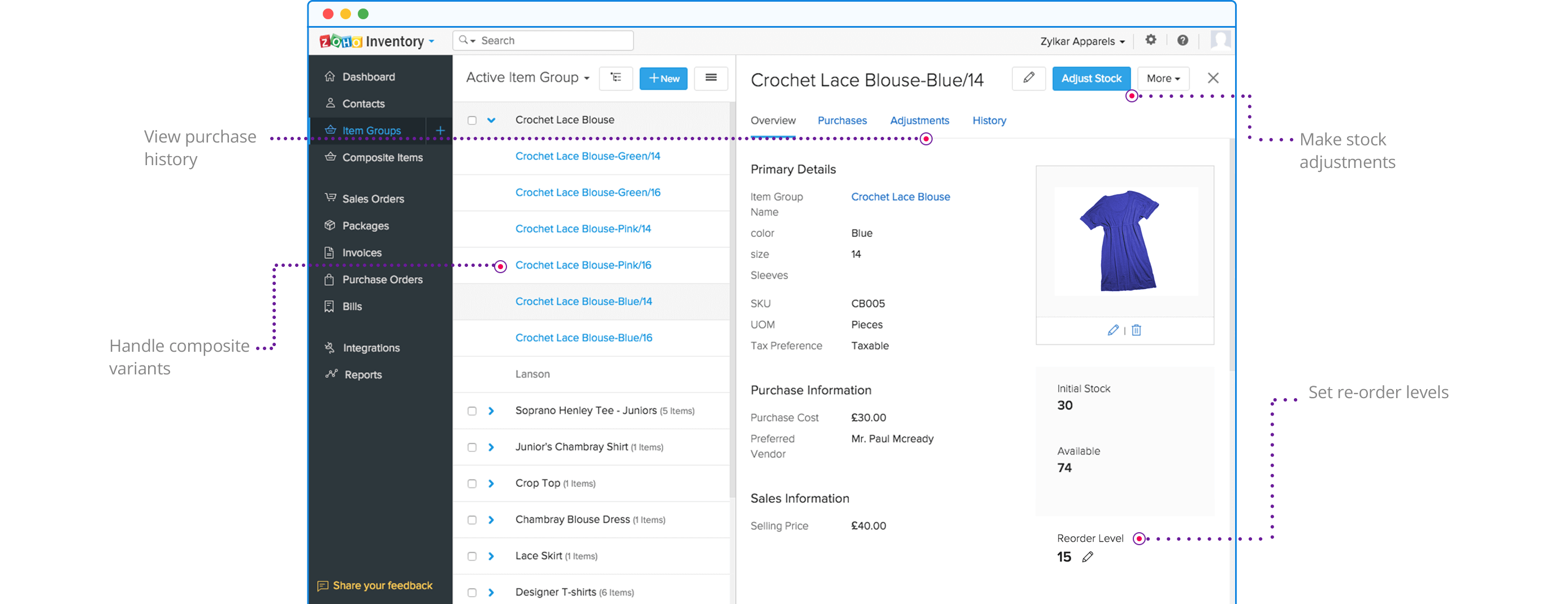 Create sales strategies, manage re-order point, and keep your customers satisfied with Zoho Inventory, a complete inventory control system.