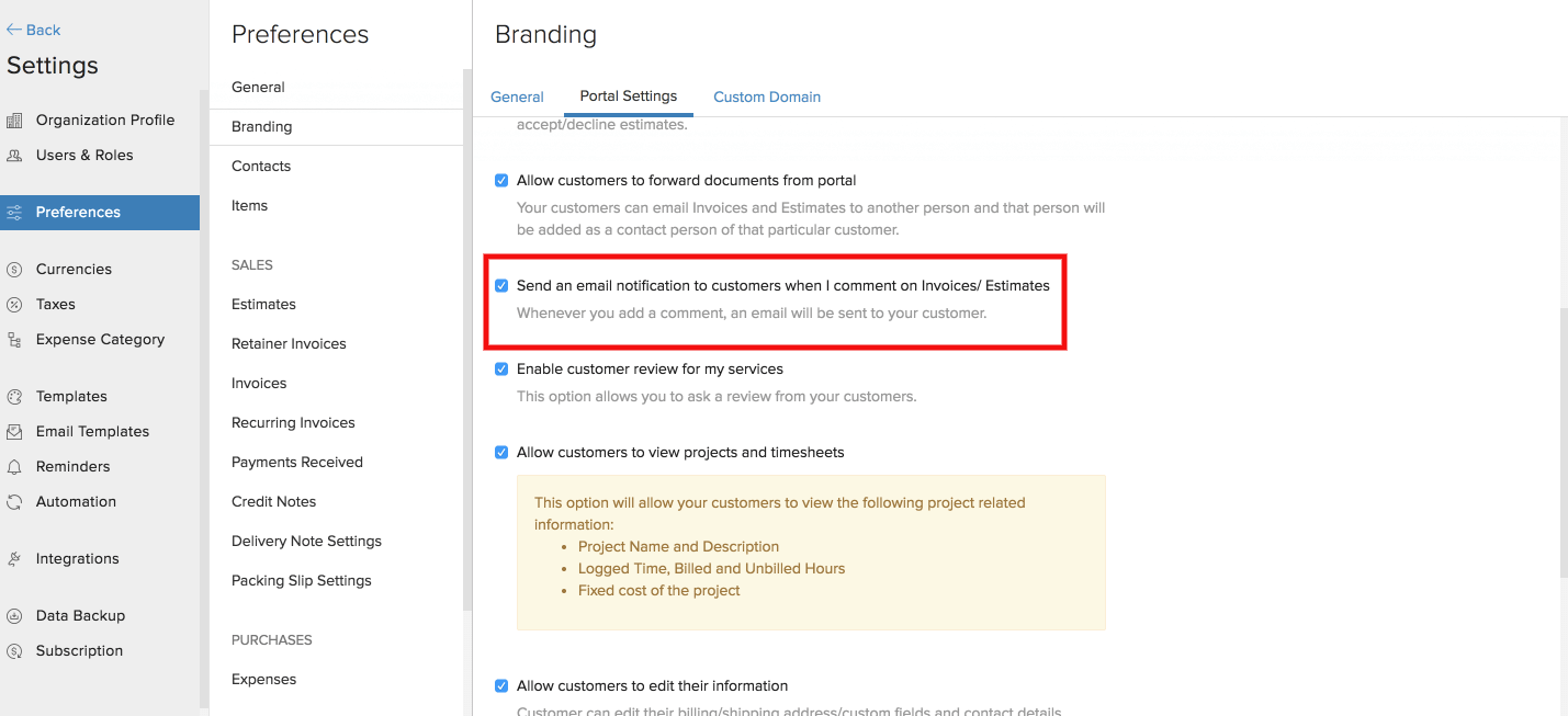 - Check the box Send a notification email when I comment on invoices/estimates and hit the Save button at the bottom of the page.