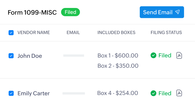 Easily distribute 1099 forms to all your vendors. With Zoho Books, you can email forms, send in bulk, or share through our vendor portal, making it simple to fulfil your reporting obligations.