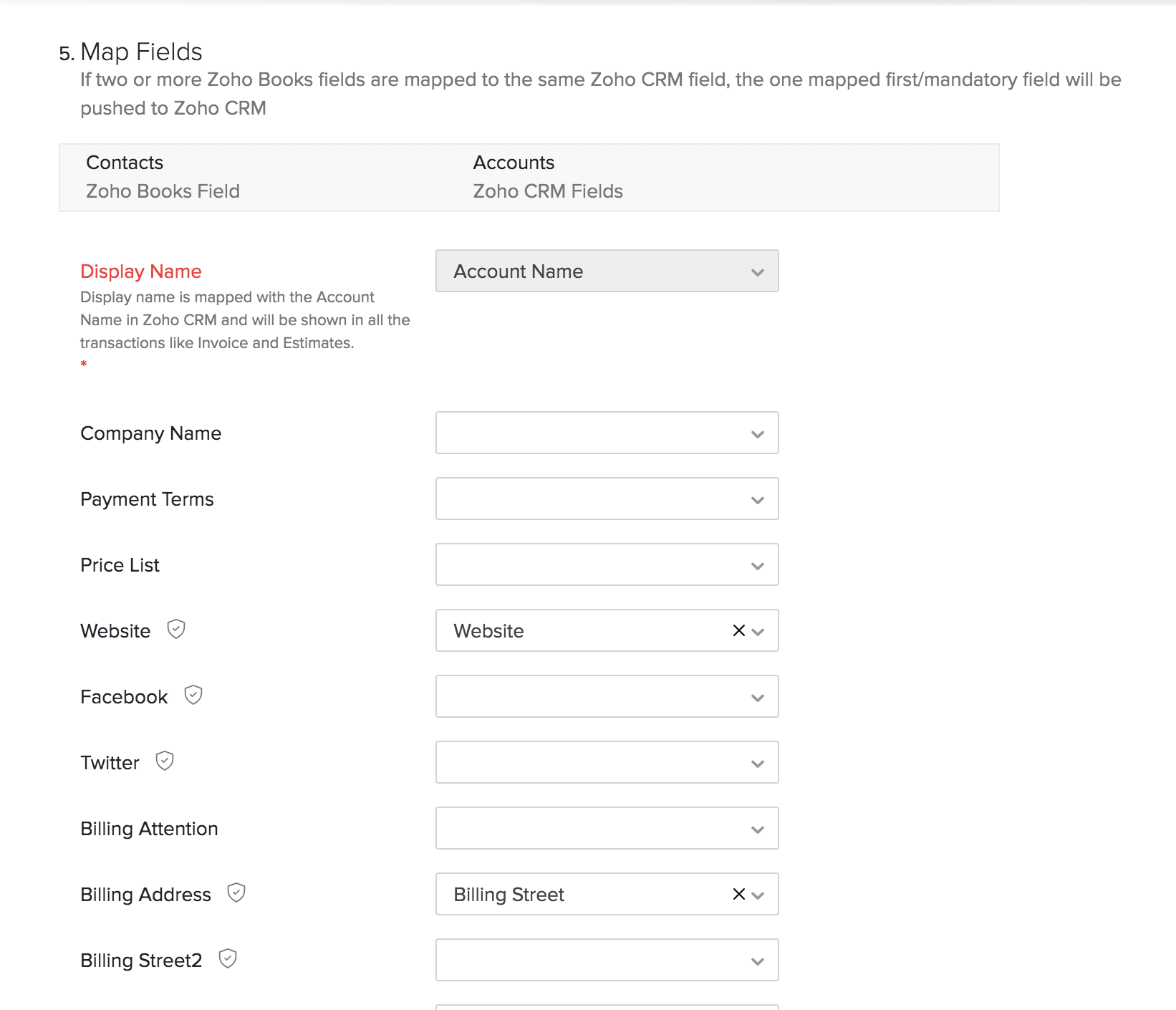 - Map Fields: Match the fields in Zoho Books with the corresponding fields in Zoho CRM. You can also create custom fields in Zoho Books to match the fields in Zoho CRM, if required.
