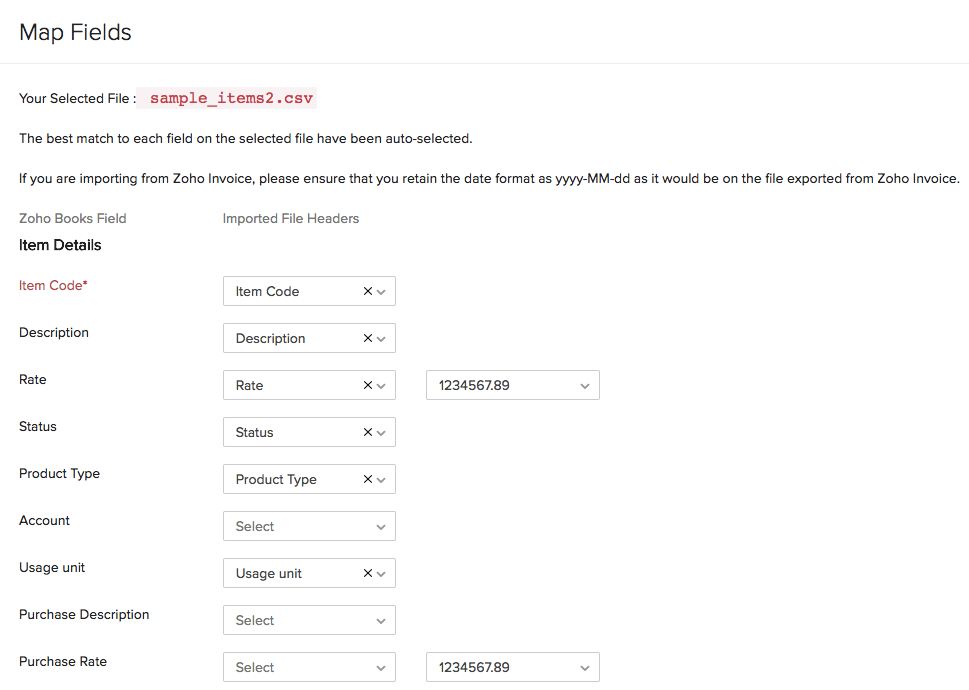 Note: These fields are case-sensitive and will only be overwritten if the value in field name matches in both the import file and Zoho Books.