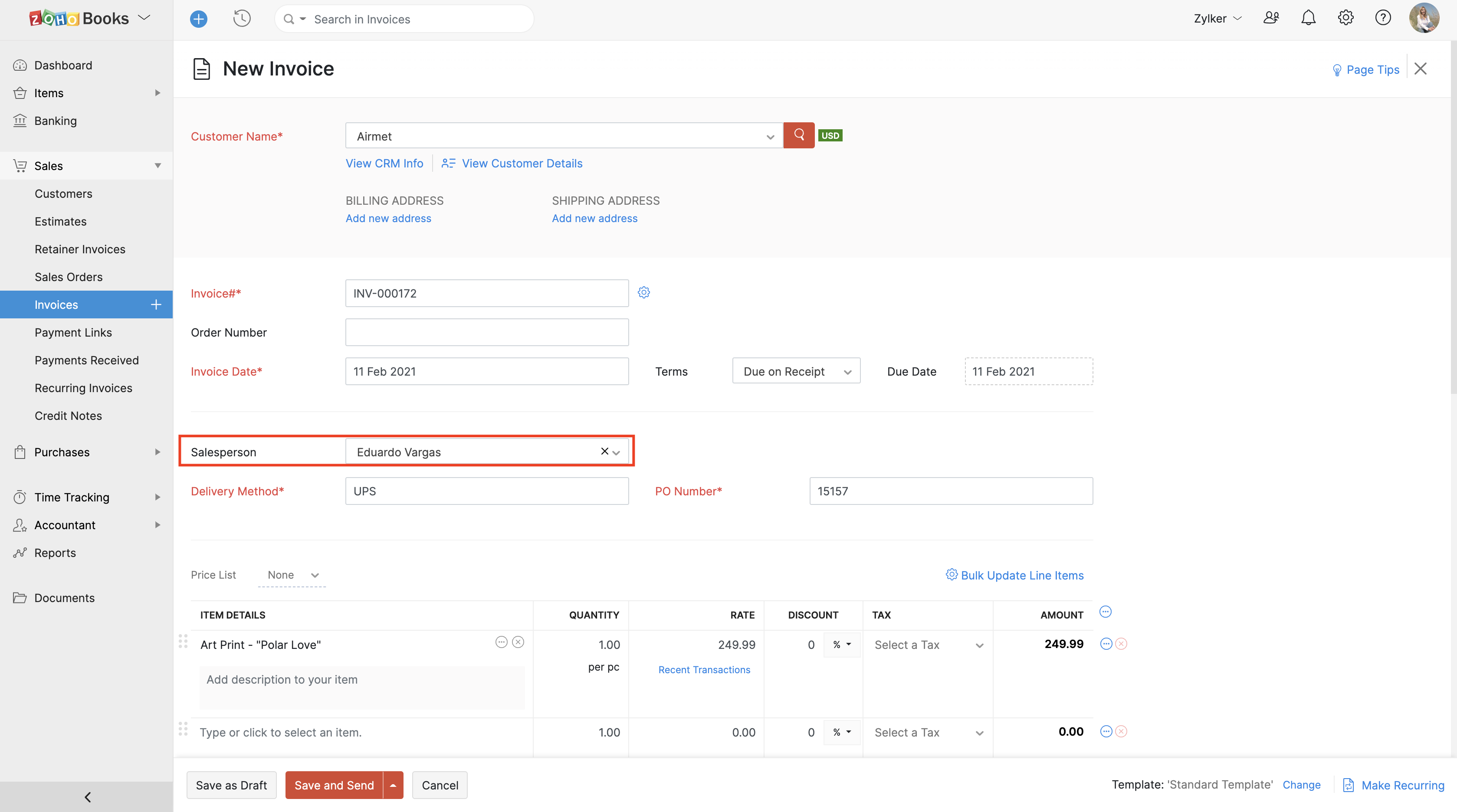 If you have associated salespersons to your transactions, you can use the Sales by Salesperson report to track the summary of all the invoices and credit notes that different sales persons have created in your organization.