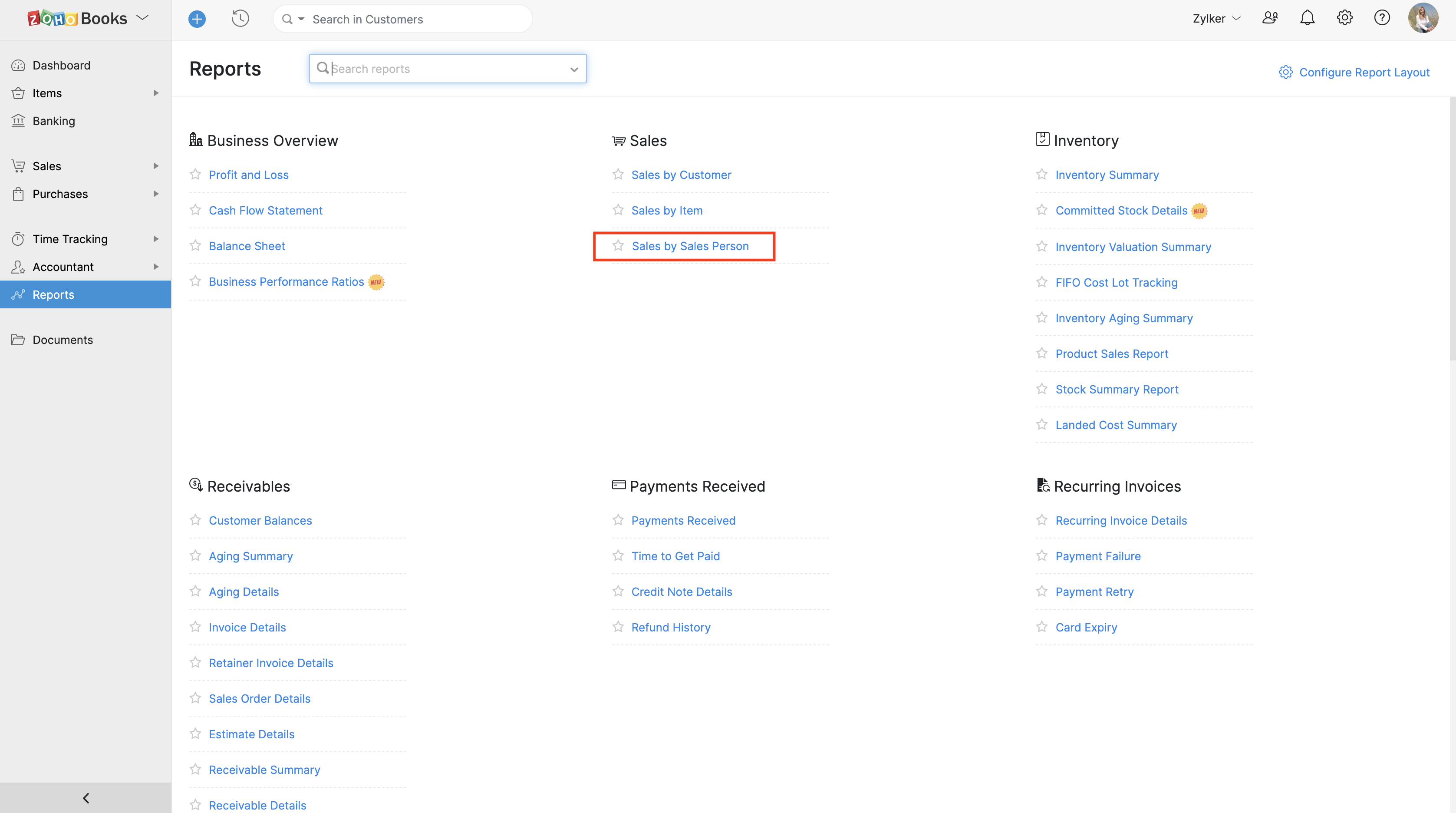 - Under Sales, click the Sales by Salesperson report.