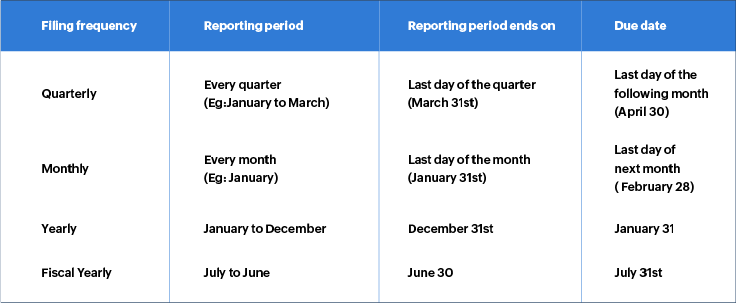 In California, the filing frequency can be quarterly prepay, quarterly, monthly, yearly, or fiscal yearly. You must complete your CA sales tax filing by the last day of the month following the assigned filing period. For example, if you are filing quarterly sales tax for January - March, the filing period ends on March 31 and the due date will be April 30. Here's a table showing how the due dates work for each filing frequency: