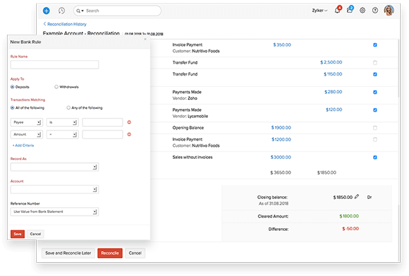 - Set up custom criteria and bank rules to categorize and match imported bank transactions automatically.